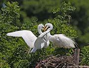 Great Egrets are also called Great White Egrets and are found in all the continents except Antarctica. They are the symbol of the National Audubon Society. They feed on fish, frogs, or insects by spearing them with their long bill. Both sexes are similar. In the breeding season (Feb-July), the tail feathers are longer.