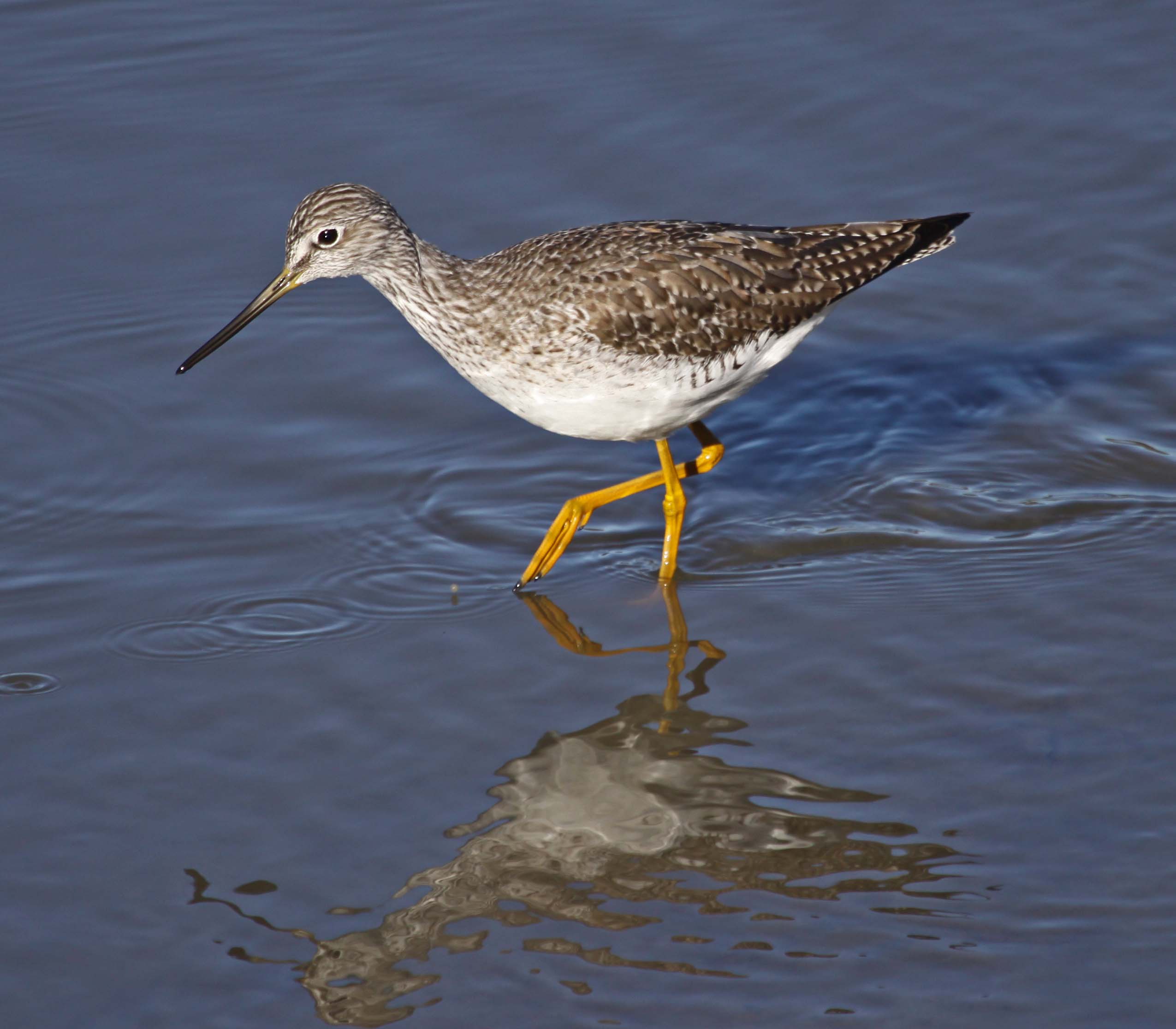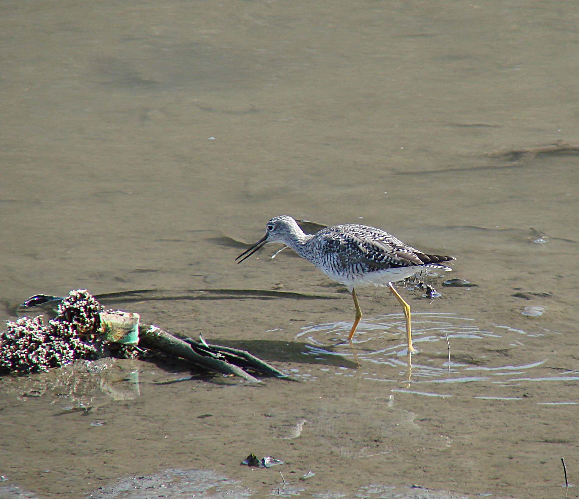 The Greater Yellowlegs breeds in Canada and Alaska and winter from southern U.S. to the tip of South America. A distinguishing characteristic of the Greater Yellowlegs is their long yellow legs. They bob the front part of their body up and down. They are more common in the Bay Area than their counterpart, the Lesser Yellowlegs.
