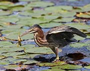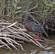 The Green Heron is a small heron found in North America and northern South America. It is a subspecies of the Green-backed Heron Butorides striata. They are found in wetlands in low-lying areas. They sometimes can be hard to spot because they like to hide in vegetation along the shoreline. While there is a hint of green on their back, they are more noticeable because of the rust colored neck.