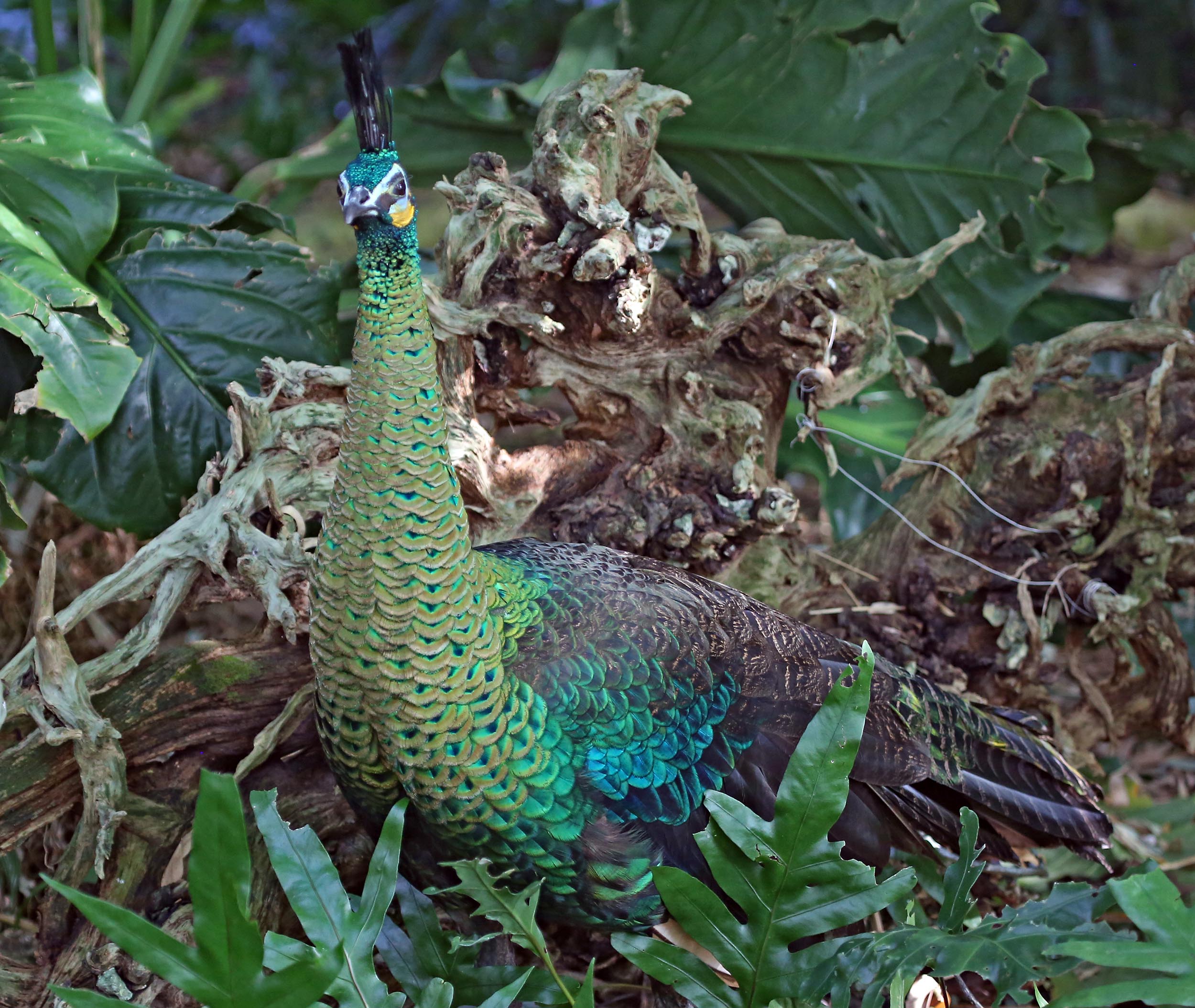 The Green Peafowl is also known as the Java Peafowl. They are found in the tropical forests of Southeast Asia. The lengths above do not include the tail. In males the tail is an additional 40-57 cm and the train, 14-160 cm. In females the tail is an additional 40-45 cm.