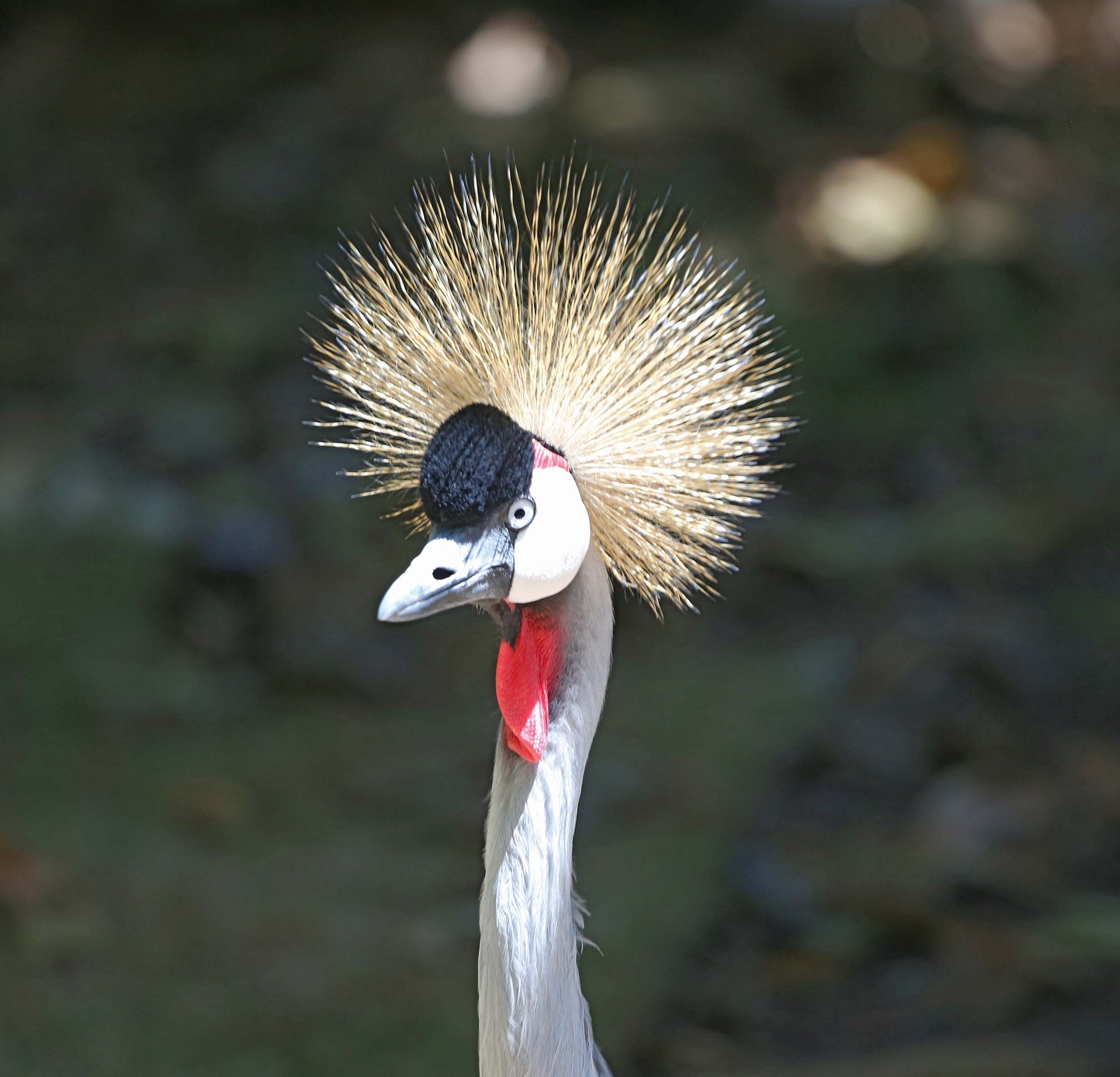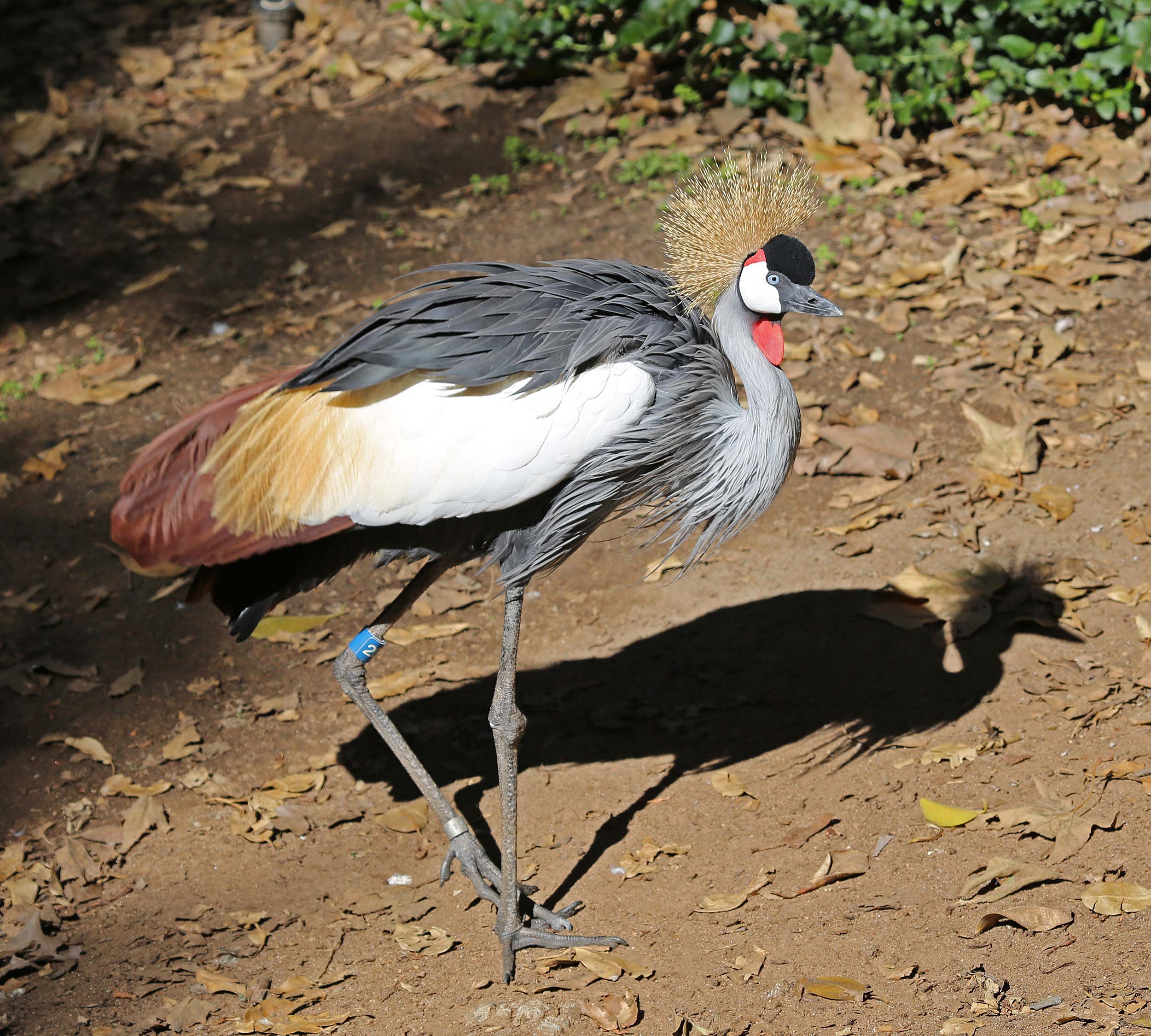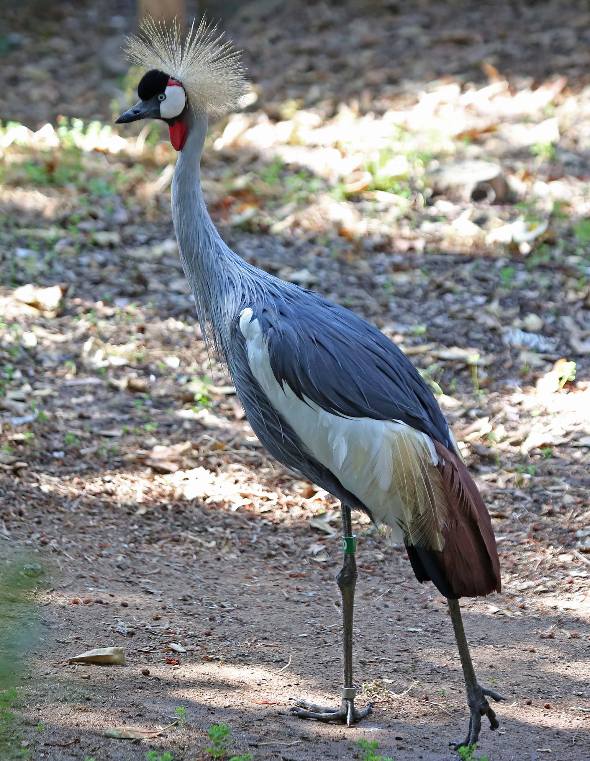 The Grey Crowned Crane is also known as the East African Crowned Crane. They are found in Africa and they are the national bird of Uganda and features in the country's flag and coat of arms. They are very similar to the Black Crowned Crane. There are two subspecies of Grey Crowned crane: the more abundant East African Grey Crowned Crane (Balearica regulorum gibbericep) and the South African Grey Crowned Crane (Balearica regulorum regulorum). (I only have pictures of the East African subspecies.) The two subspecies can be visually distinguished from each other by the size of the red skin above the white cheeks. The Eastern subspecies has a larger bare patch of red facial skin above the white cheek patch. Sexes are similar in each subspecies.