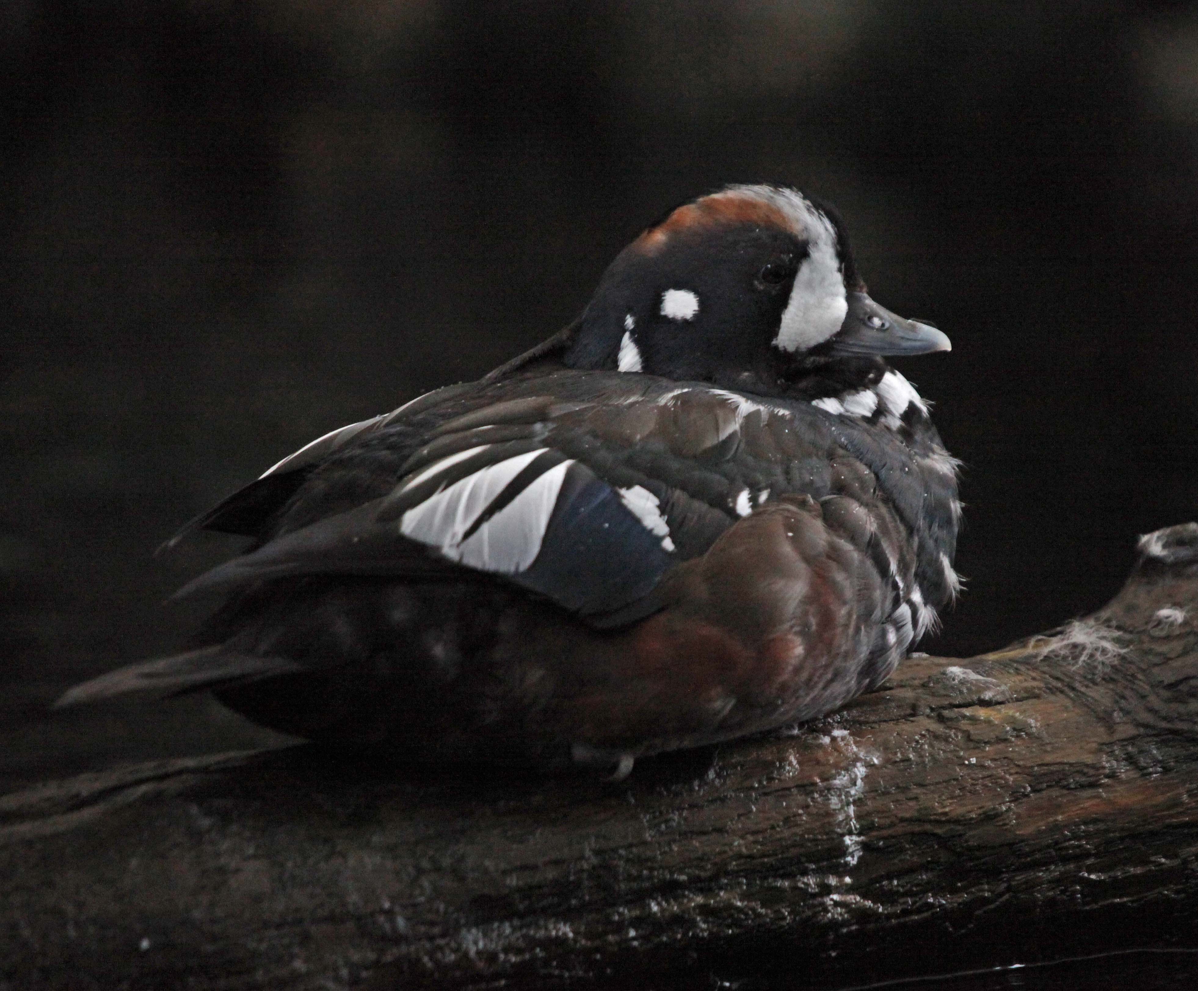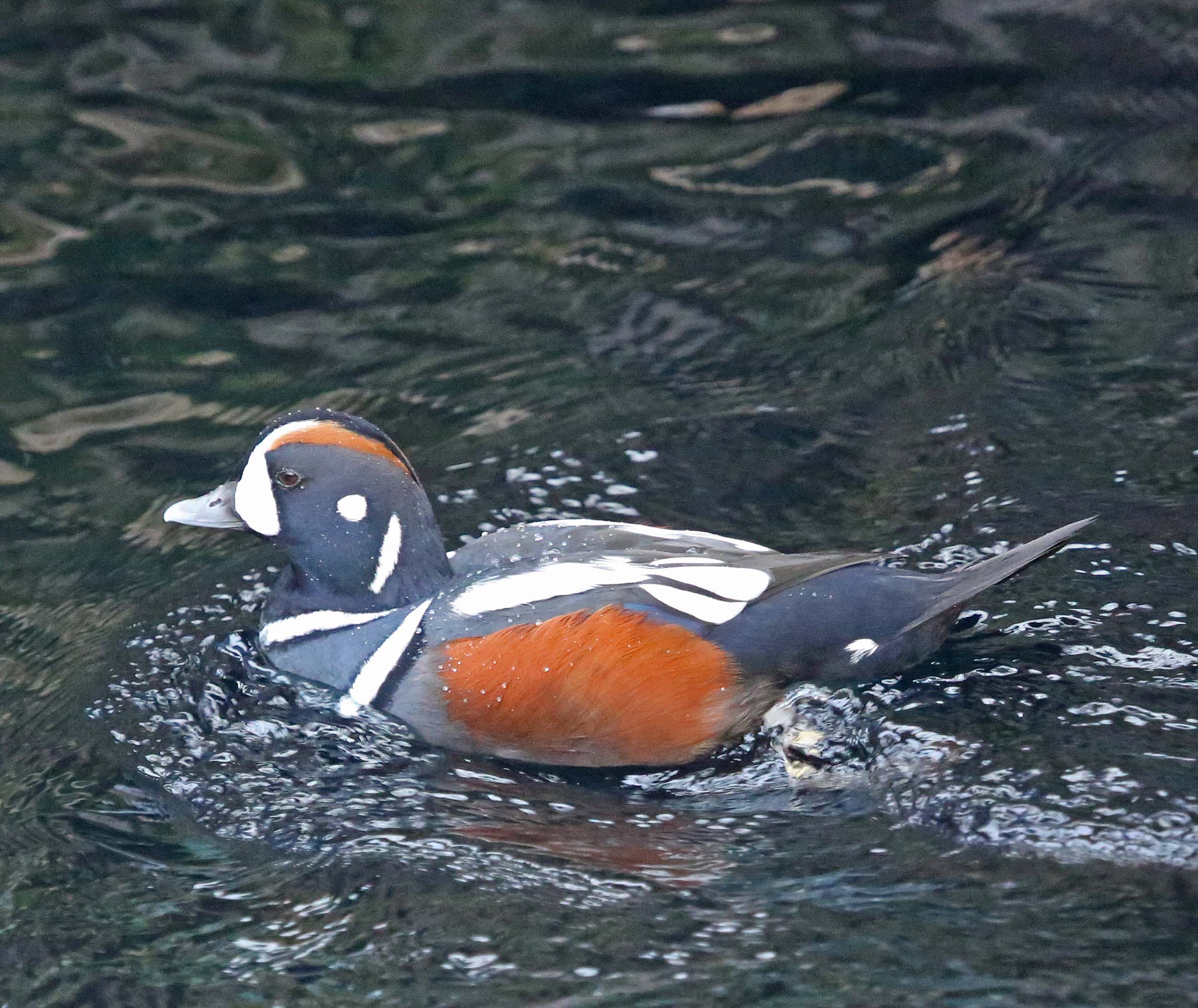 The Harlequin Duck is a small sea duck. They are definitely one of the most beautiful ducks in the world. They are mostly found on the coasts of Asia, North America, Greenland, and Iceland. In North America they breed near cold fast moving streams on both coasts. They eat mollusks, crustaceans and insects.