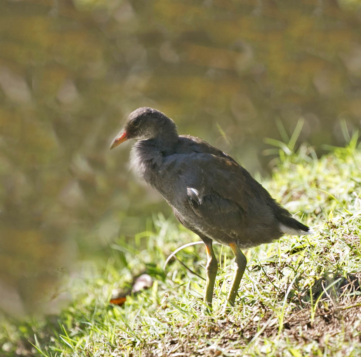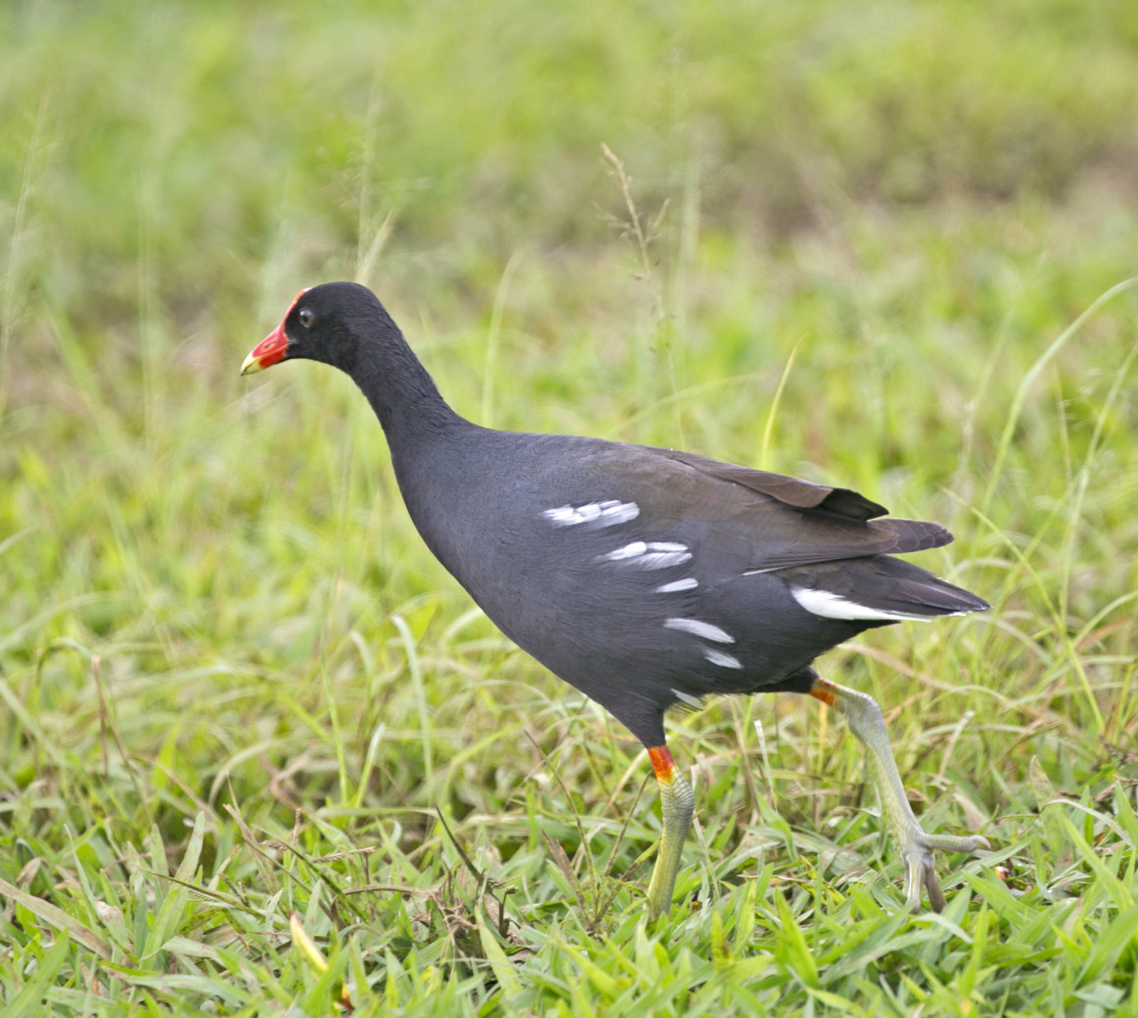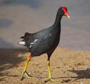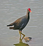 A subspecies of the Common Moorhen, the Hawaiian Moorhen or 'Alae "Ula can be found on Kaua'i and O'ahu. According to Hawaiian mythology, a moorhen brought fire to Humans, which explains the red on its forehead.