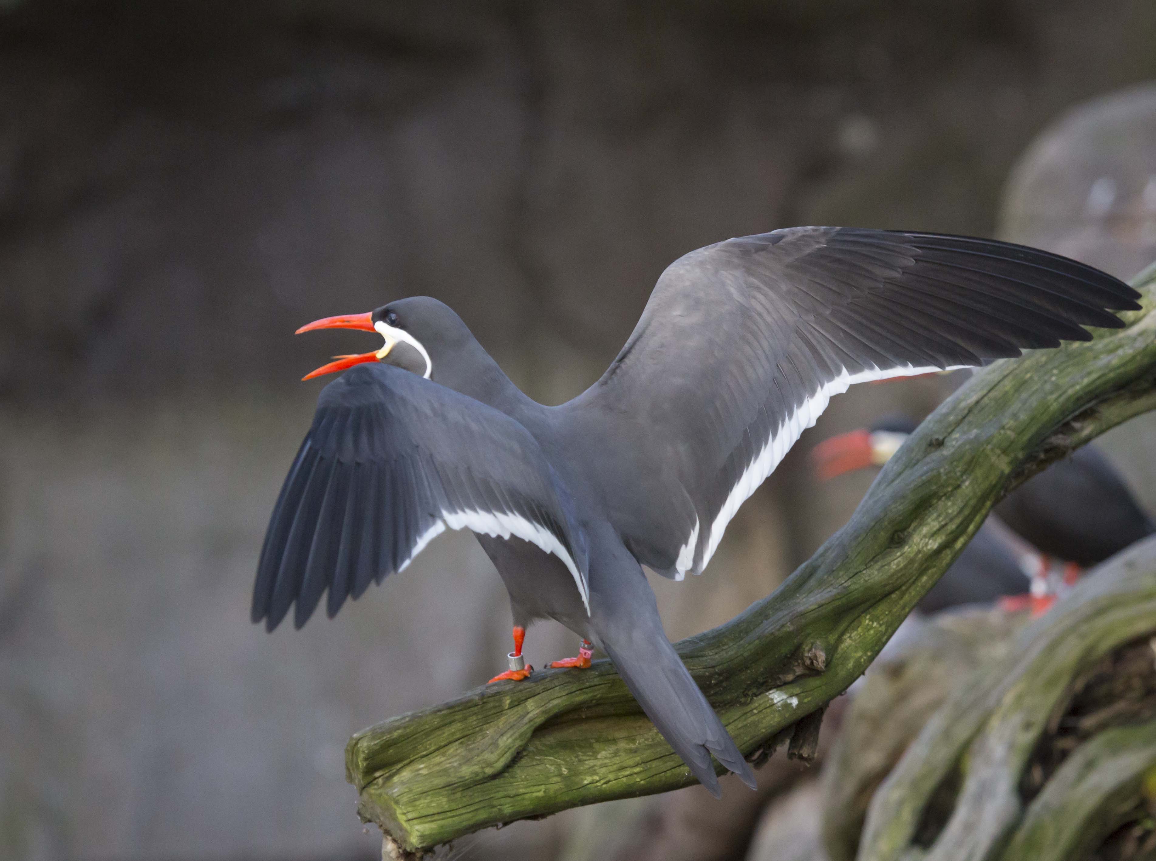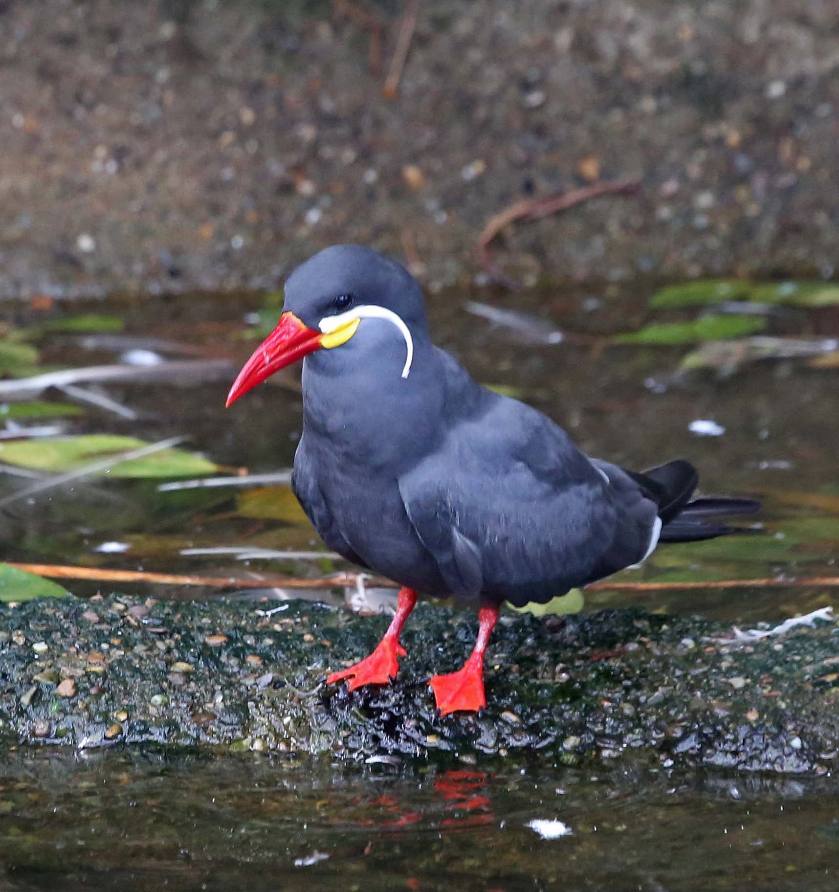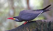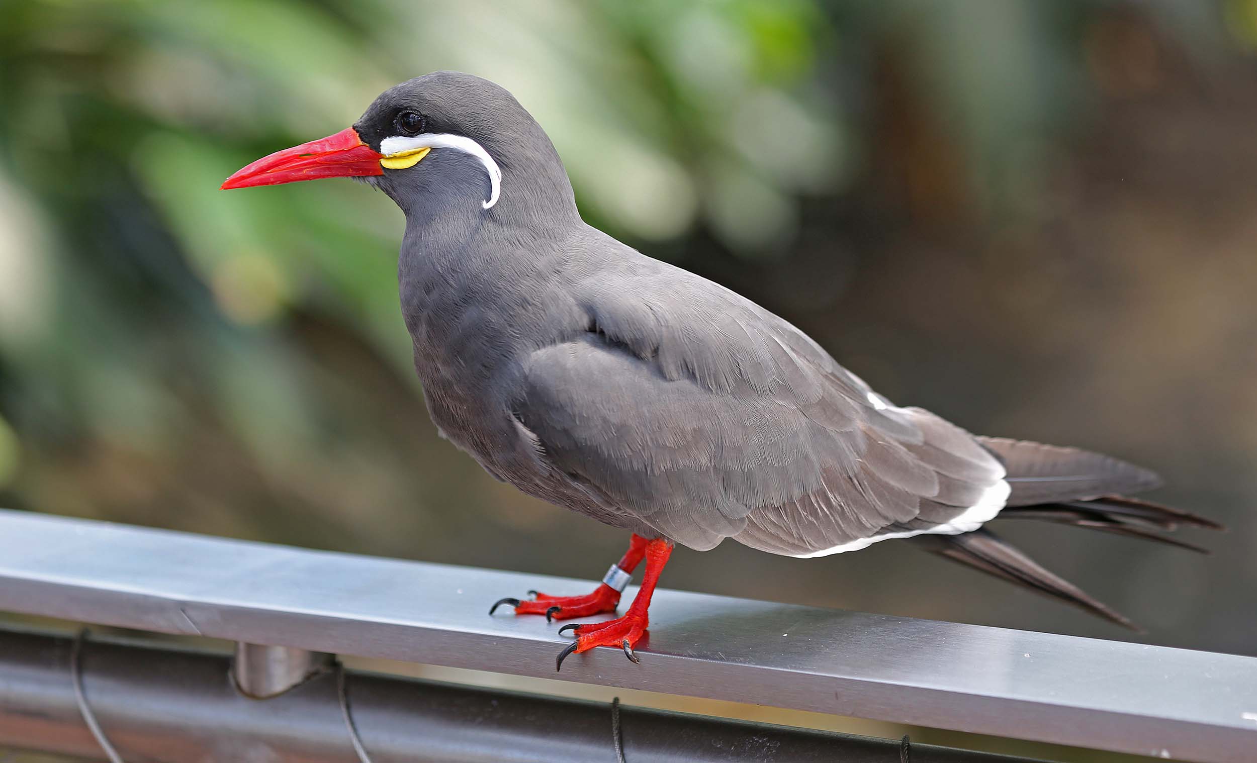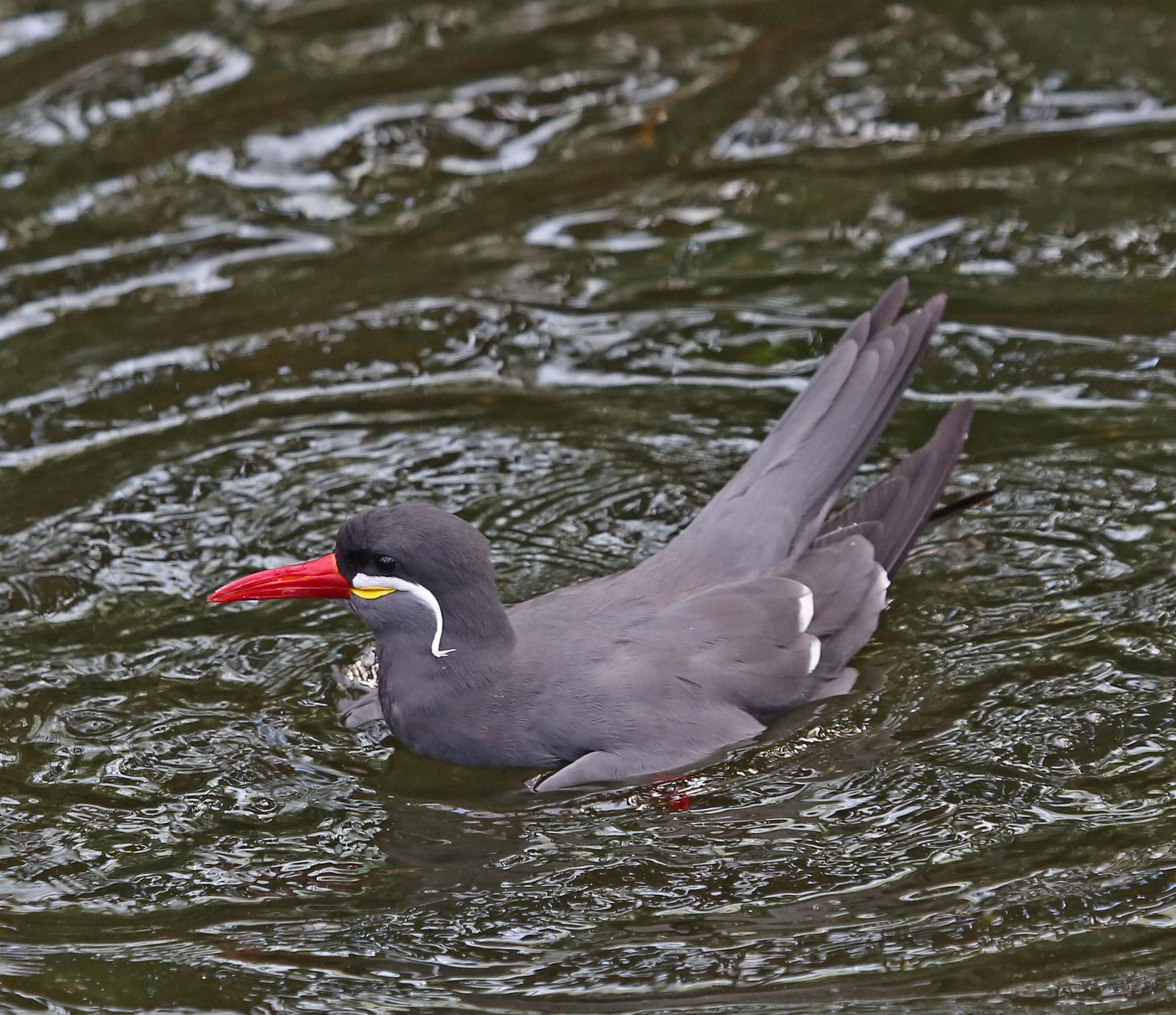 The Inca Tern is found on the coasts of Peru and Chile and is restricted to the Humboldt Current. Both sexes are similar and the adult is mostly slate-gray with white on the facial plumes and the edges of the wings. The bill and legs are dark red. Immature birds are purple-brown.