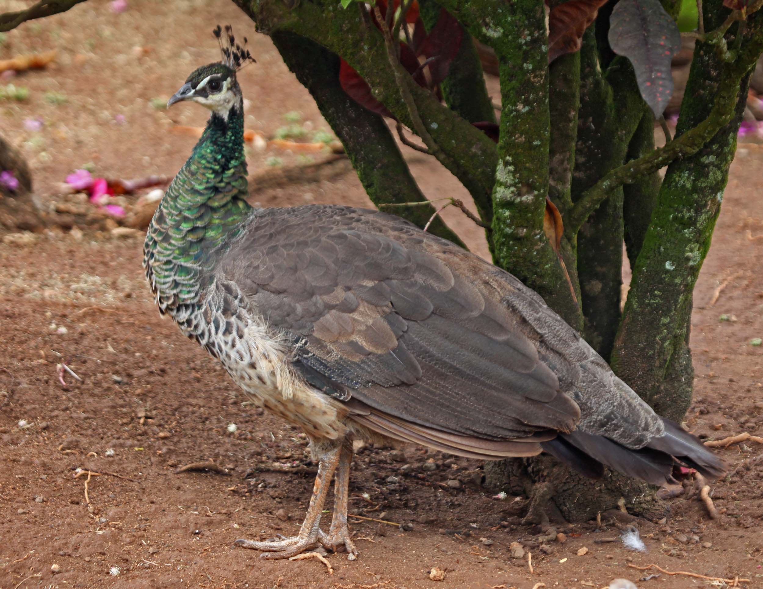 The Indian Peafowl is native to Indian and Sri Lanka but has been introduced to many other countries in the world. What we call Peacock in the U.S. is the Indian Peafowl. The male is commonly known as a Peacock and has the long tail feathers with the eyes. Peafowl eat ticks, termites, ants, locusts, rodents, plants, flower petals, seed heads, scorpions, etc.