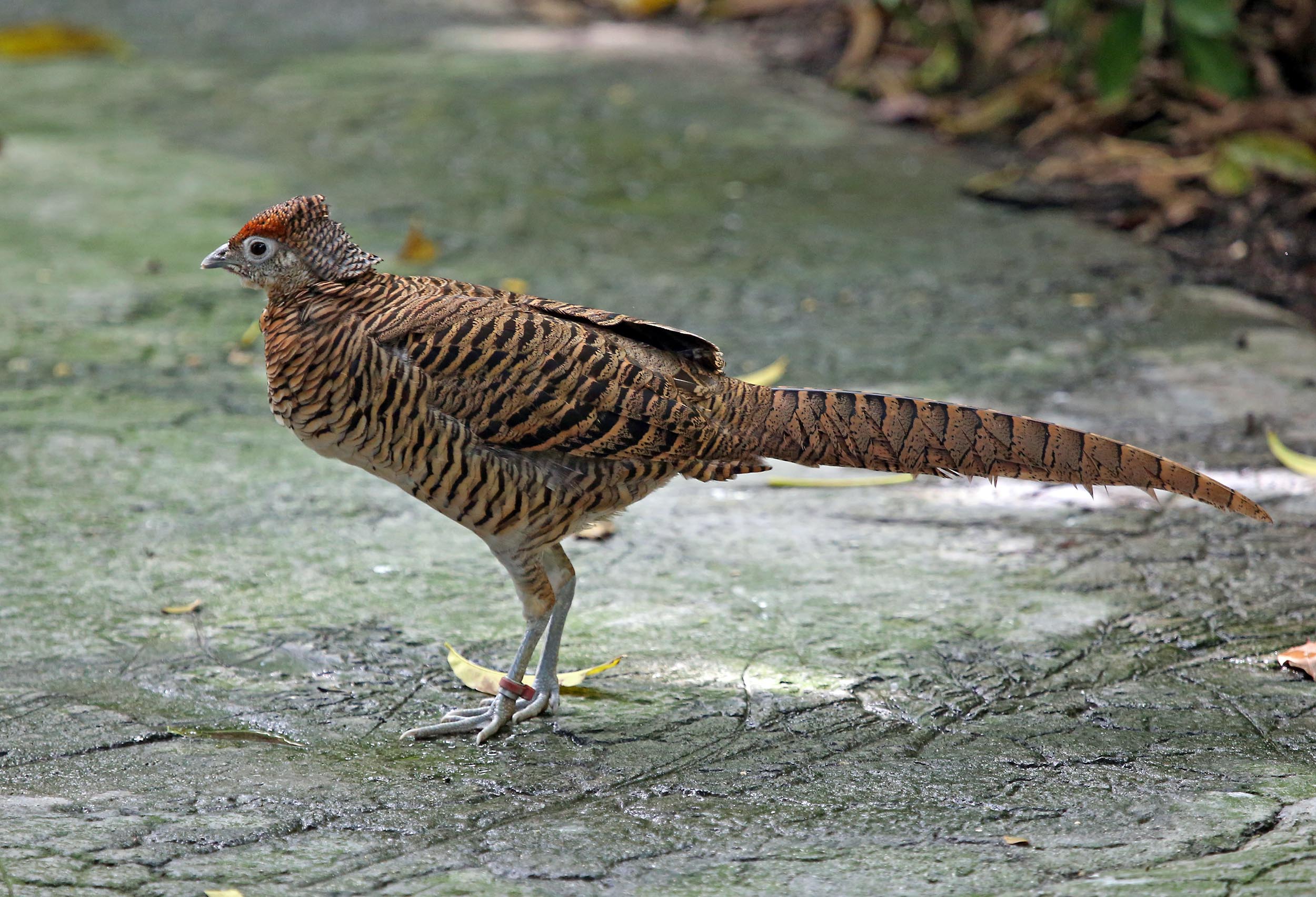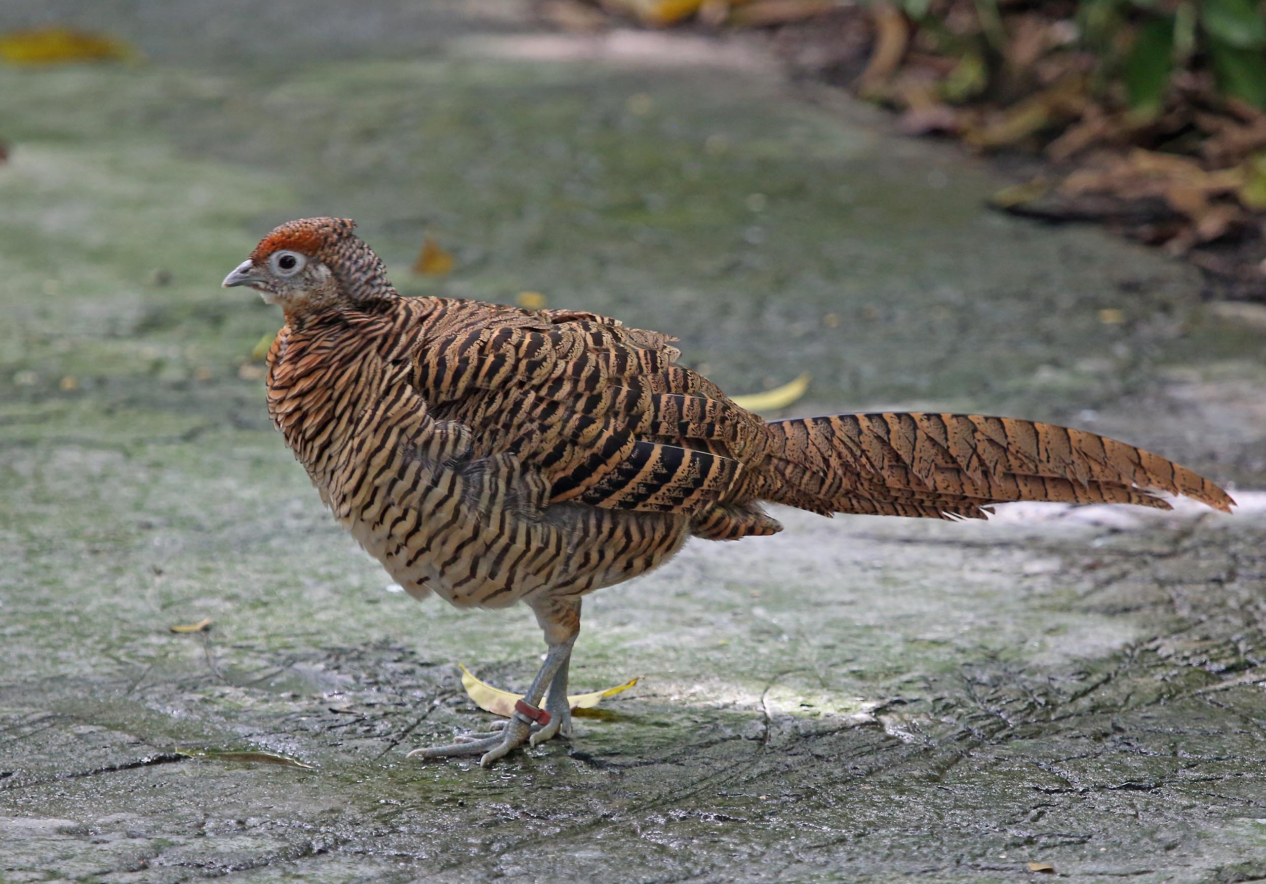 The Lady Amherst's Pheasant is native to south-western China and Burma. They eat insects, spiders, fern fronds, and bamboo shoots.