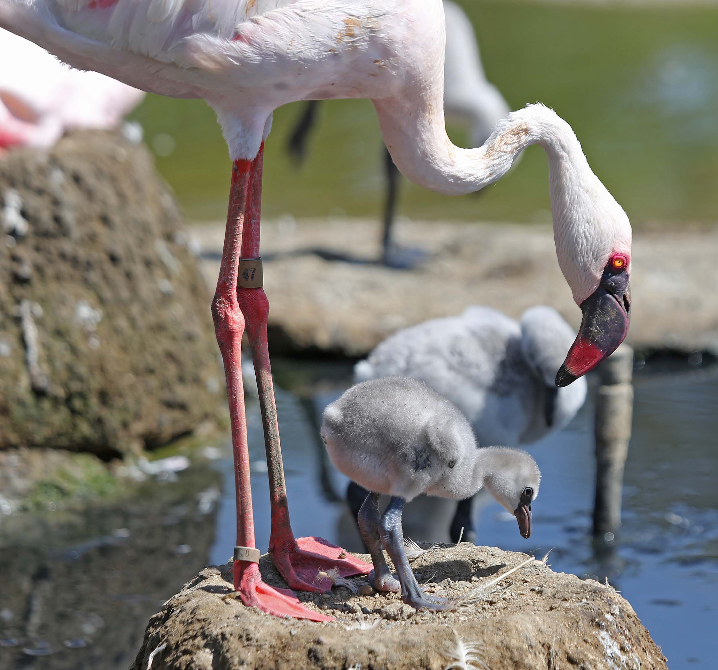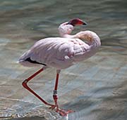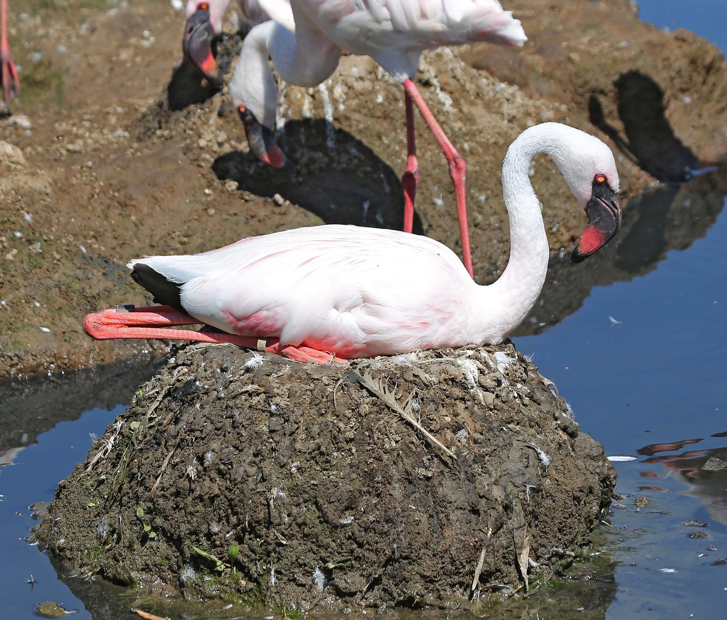 The Lesser Flamingo mainly resides in Africa with another population in India. They are the smallest species of flamingos. Most of the plumage is pinkish white and the bill is blacker than the Greater Flamingo.
