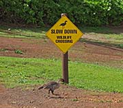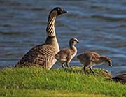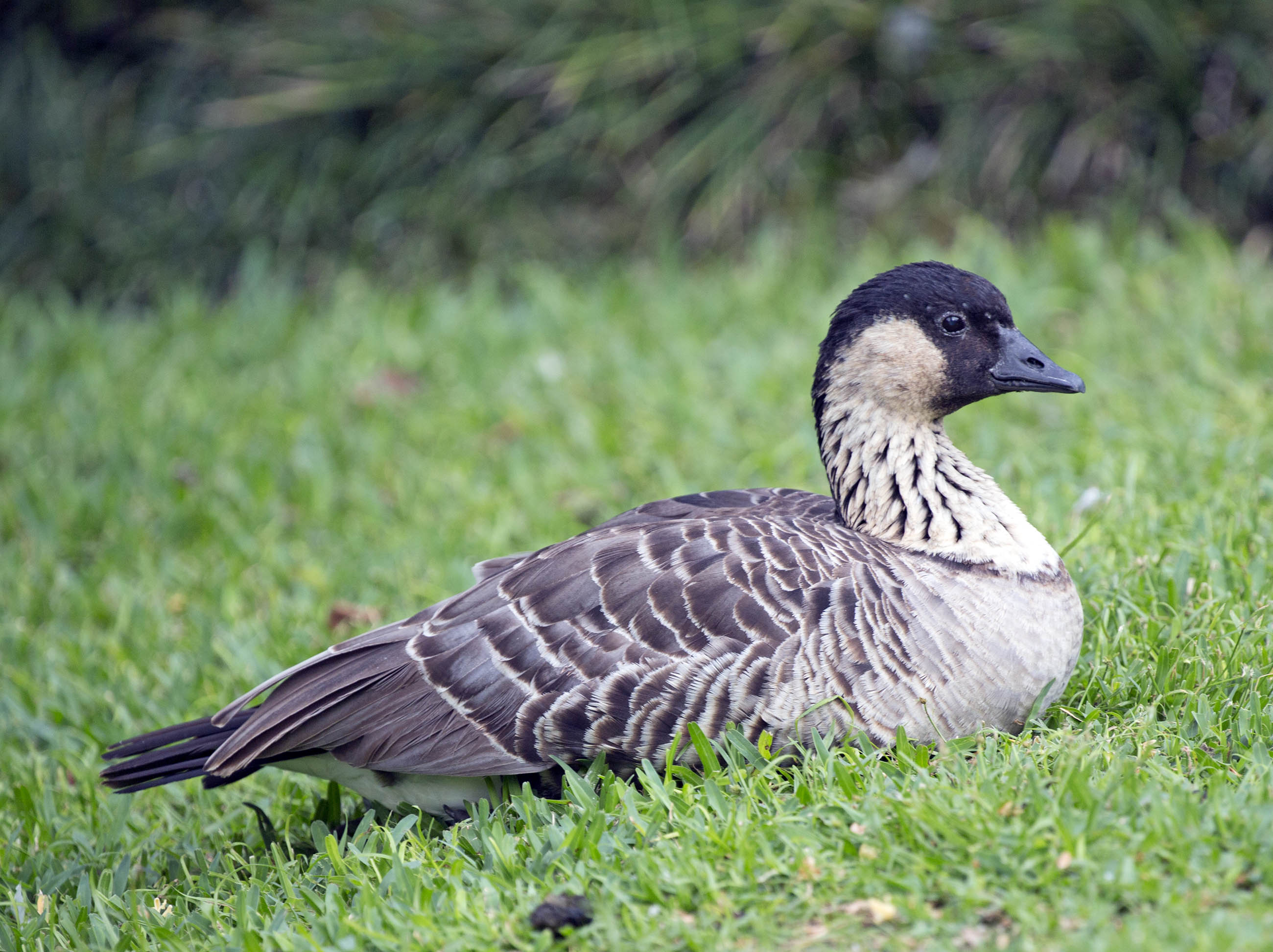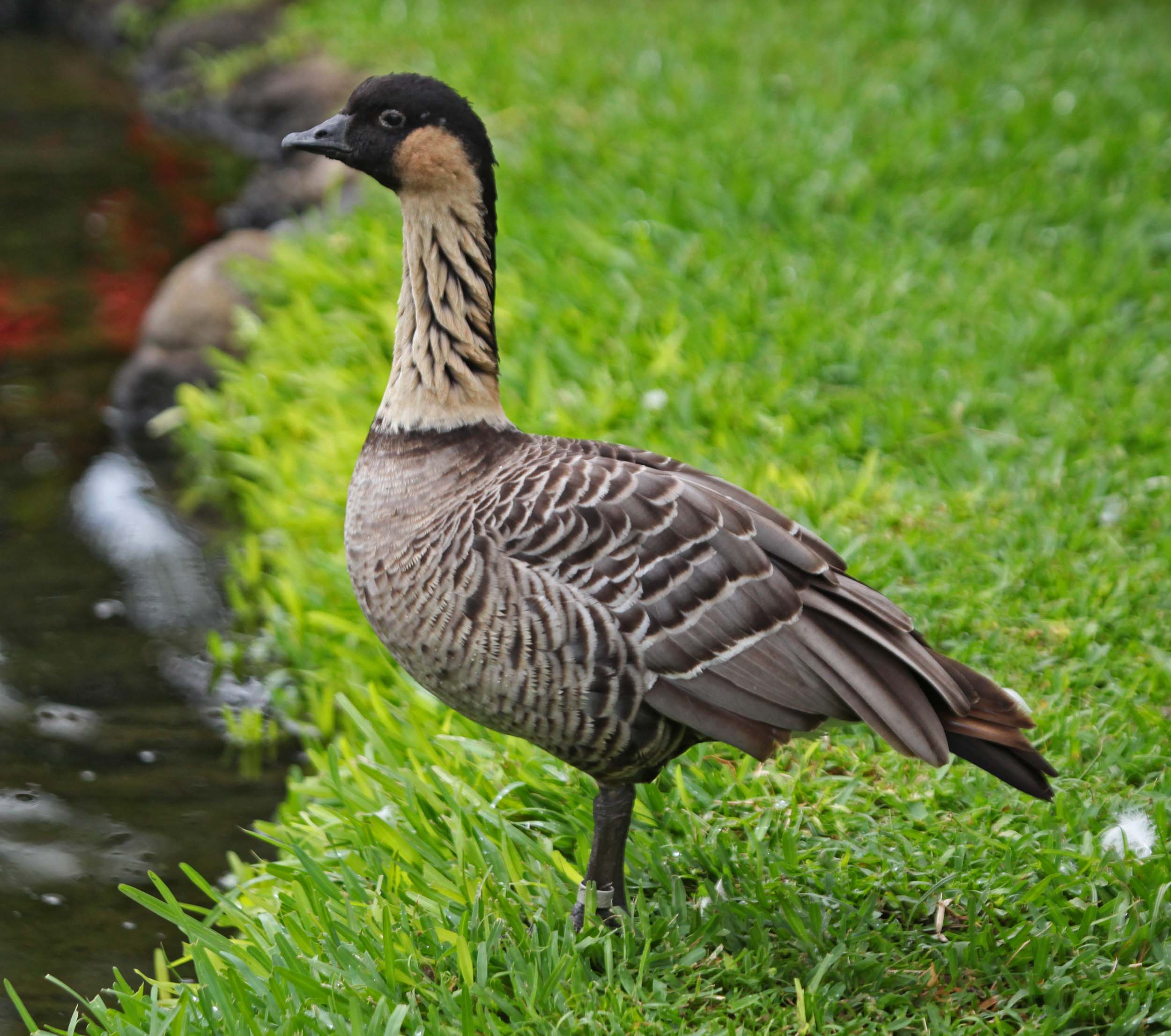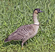 The Nene or Hawaiian Goose is endemic to the Hawaiian Islands and is the official state bird. It is found on Maui, Kaua'i and Hawai'i. They evolved from the Canada Goose which probably migrated to the Hawaiian islands 500,000 years ago. The Hawaiian Goose eats leaves, seeds, fruit and flowers of grasses and shrubs.