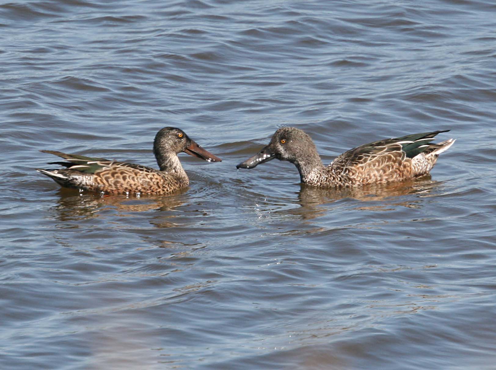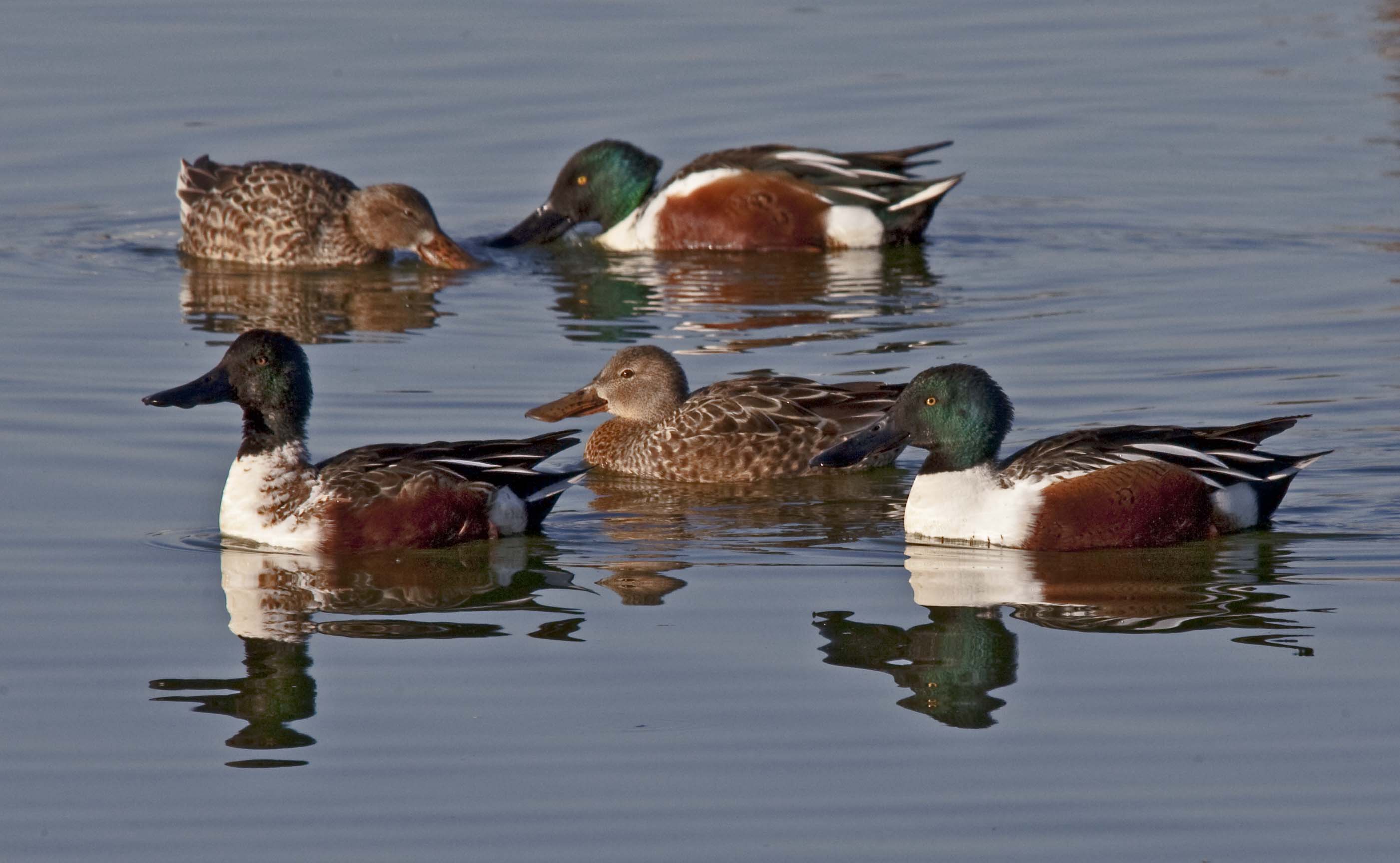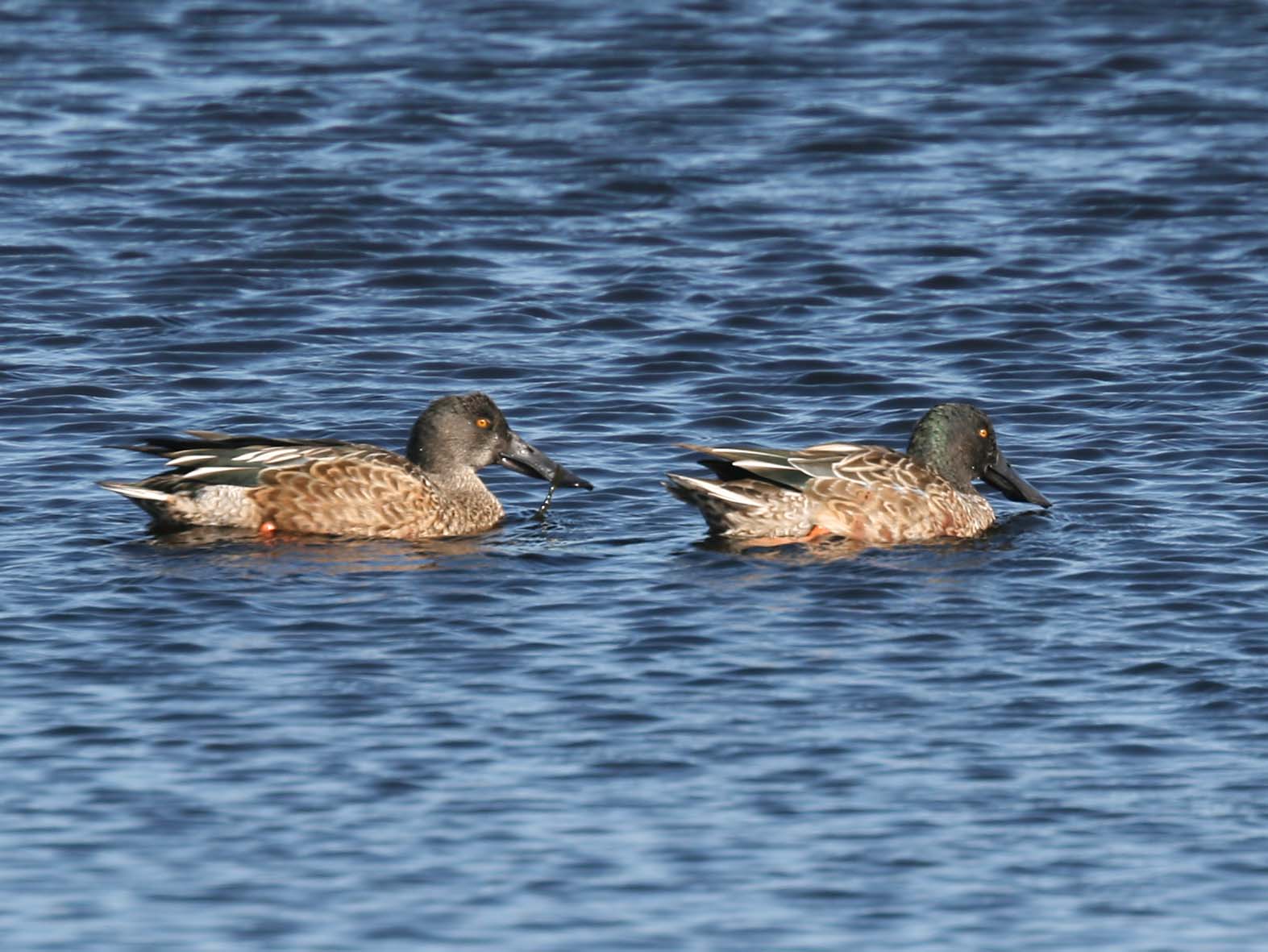 Northern Shovelers are dabbling ducks. Unlike most dabbling ducks, Northern Shovelers have a specialized beak for straining out food when they move their beak across the surface of the water. They eat small aquatic animals and plants.