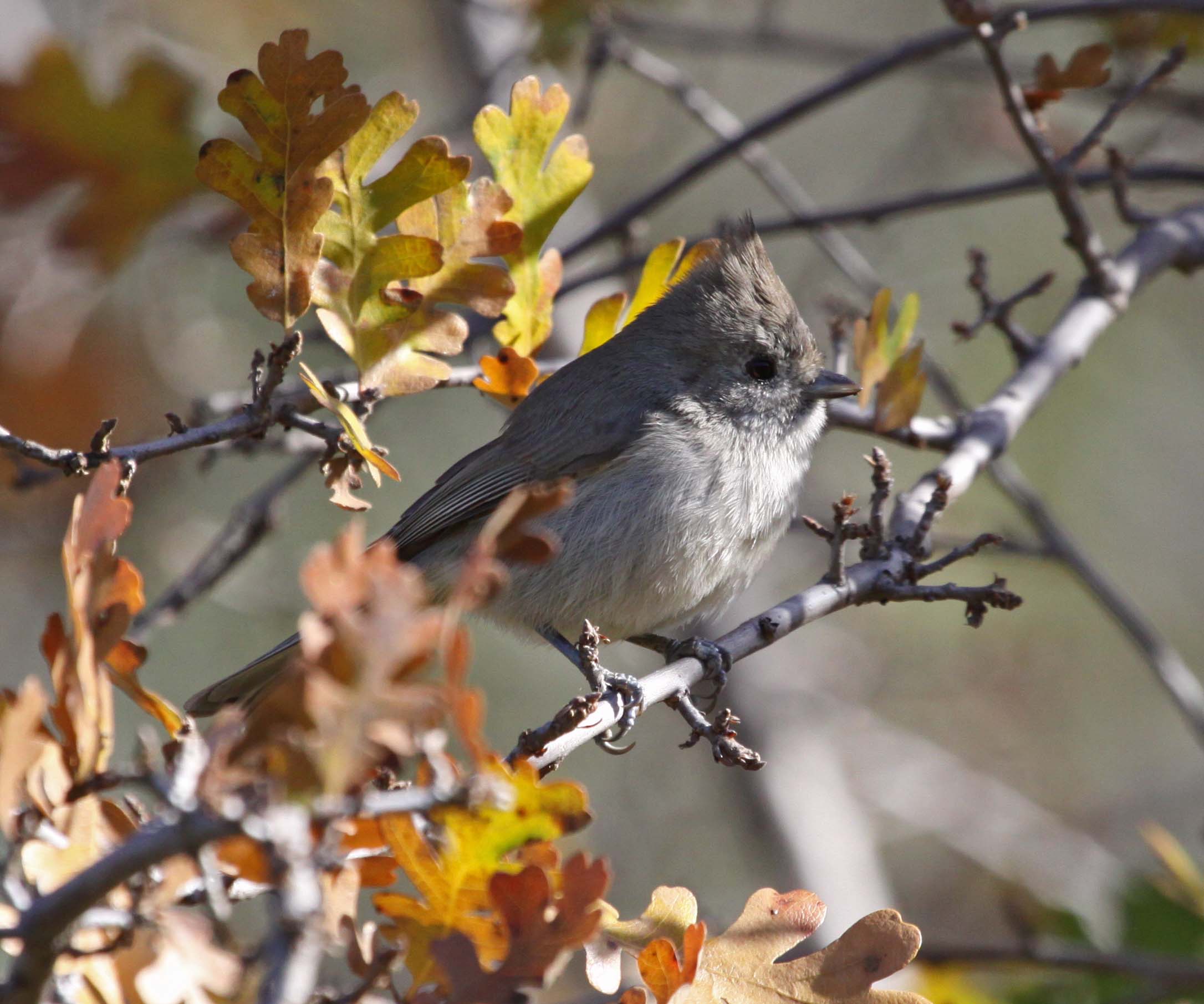The Oak Titmouse is a small passerine that is resident year-round on the Pacific coast from southern Oregon to Baja California. They eat insects and spiders and sometimes will also eat berries, acorns, and some seeds.