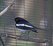 The Oriental Magpie-Robin is a Old World Flycatcher that is found the Indian Subcontinent and other parts of Southeast Asia. The male is mostly black with a white belly and white on the shoulder and tail. Females are more gray than black. Both have dark eyes, legs, and feet.