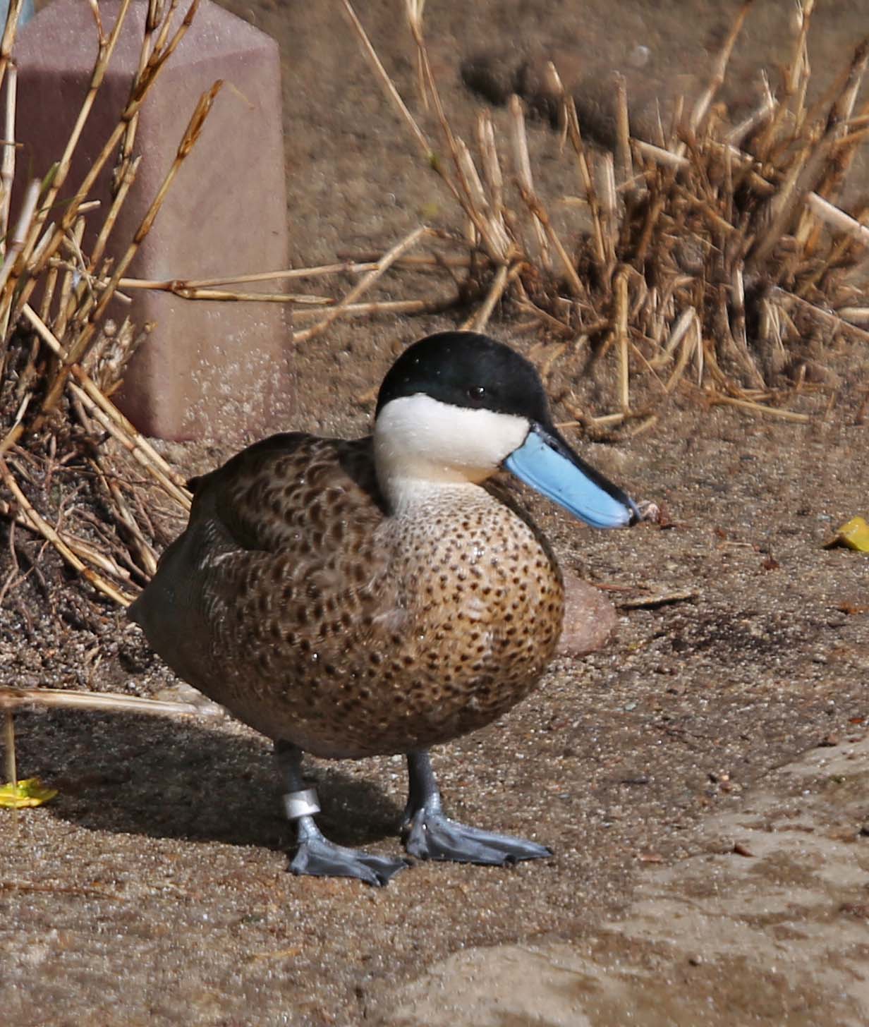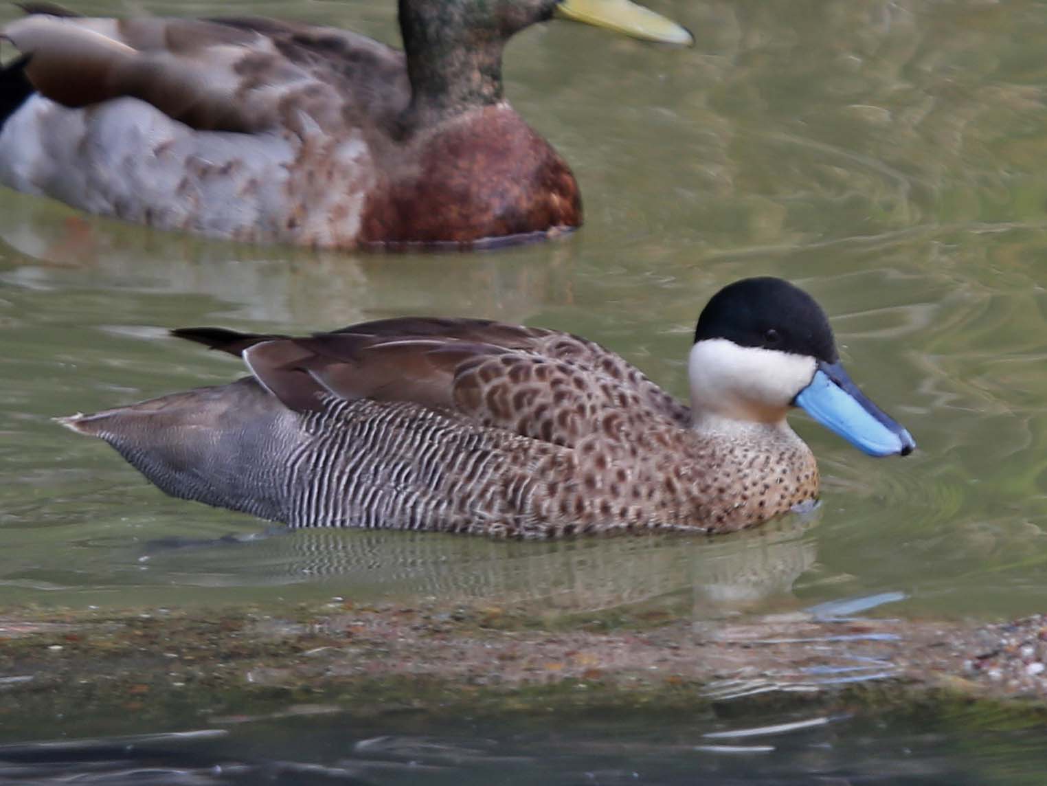 The Puna Teal is a dabbling duck that is found in South America. They are also known as the Silver Teal. Puna Teals have a black cap that extends below the eyes. The rest of the face and neck are white. They bill is large and a powder blue color with a black strip down the middle. Their body is a combination of mottled browns and grays and they have brown eyes and dark grey legs and feet.
