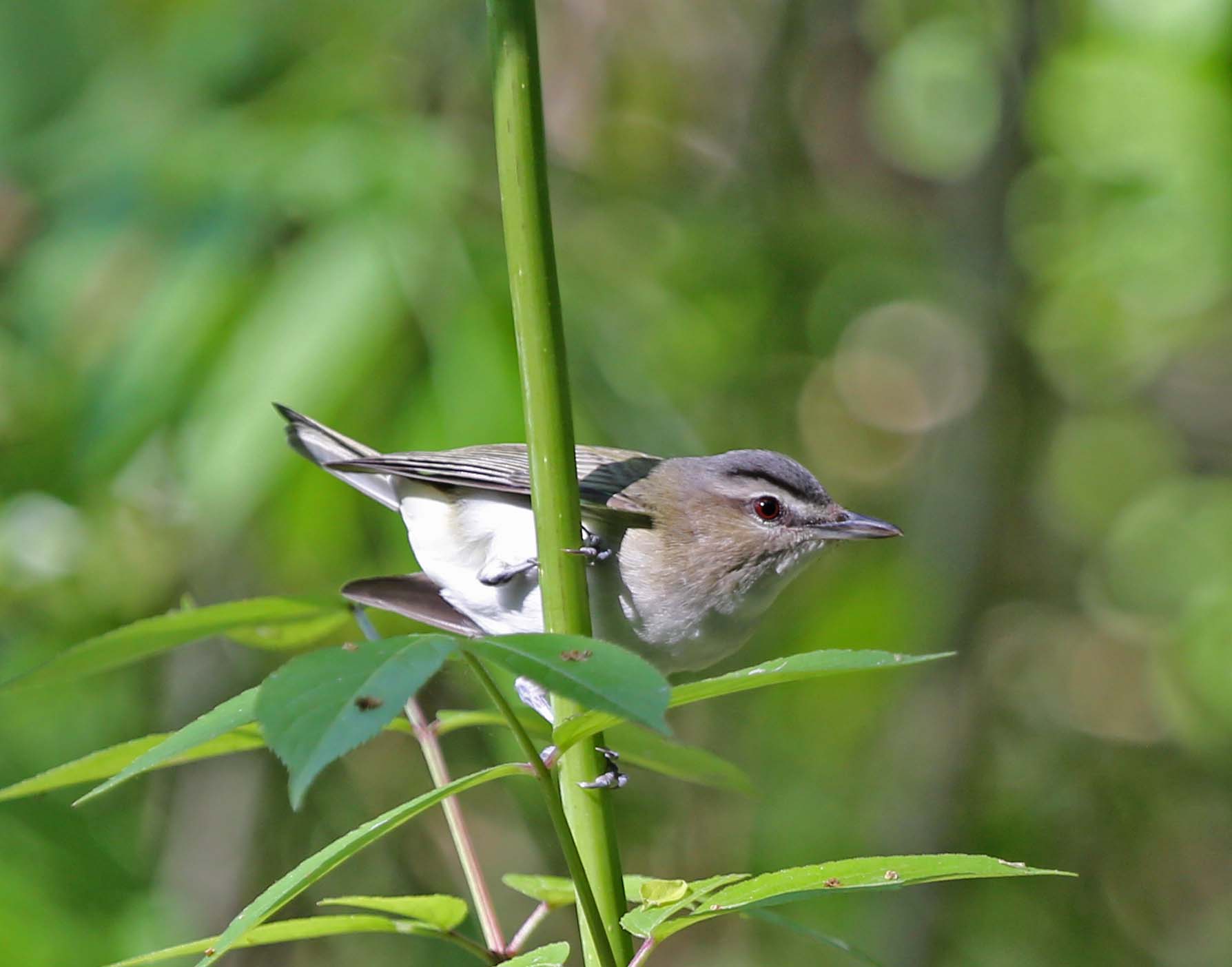 The Red-eyed Vireo breeds in Canada, the eastern and northwestern U.S. and parts of South America. North American birds winter in South America. They eat insects from tree foliage. They favor caterpillars and aphids.