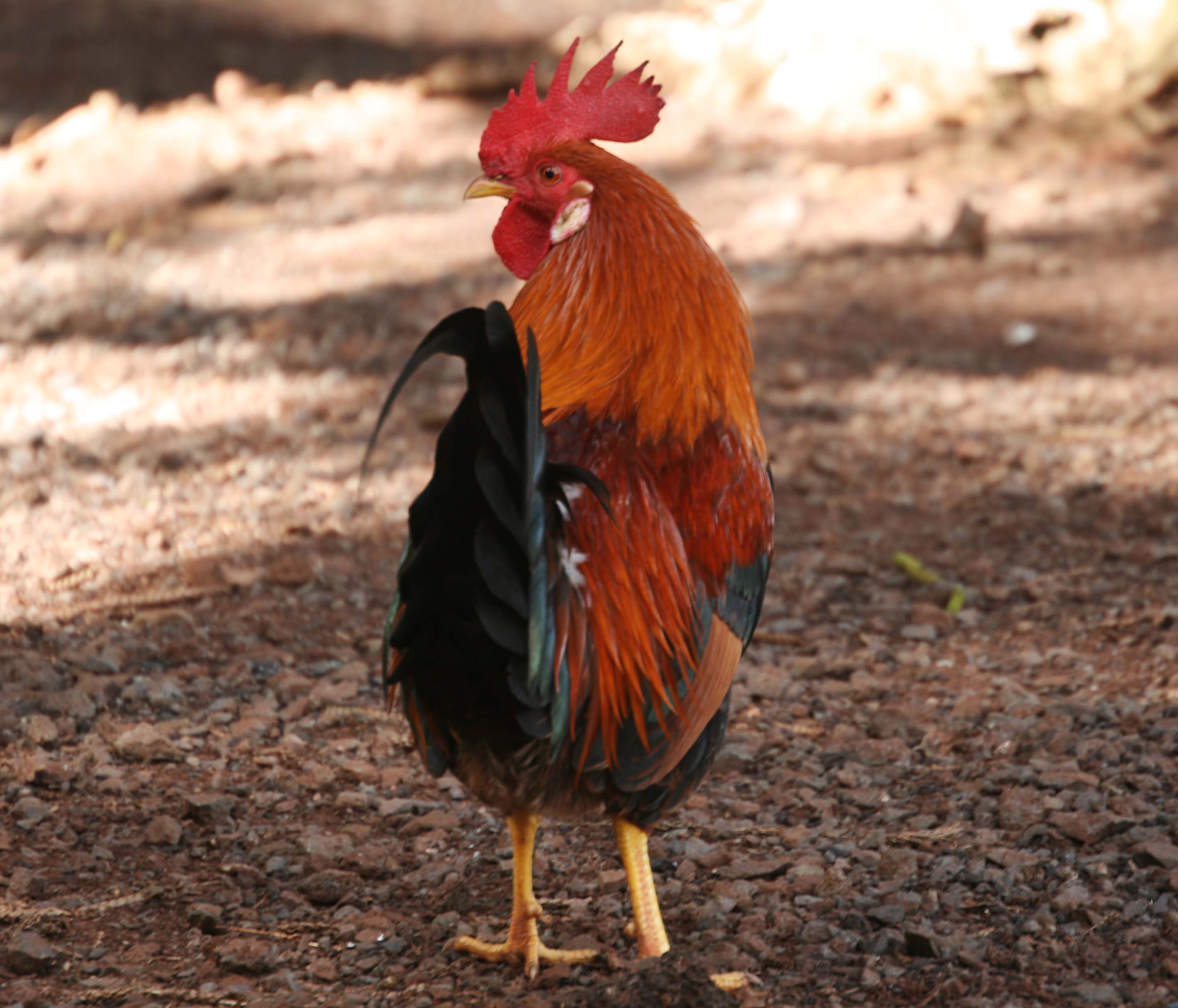 The Red Junglefowl is a tropical member of the Pheasant family. It was first raised in captivity several thousand years ago on the Indian subcontinent. They run wild on several of the Hawaiian Islands, but these birds are probably feral descendants of domestic chickens.