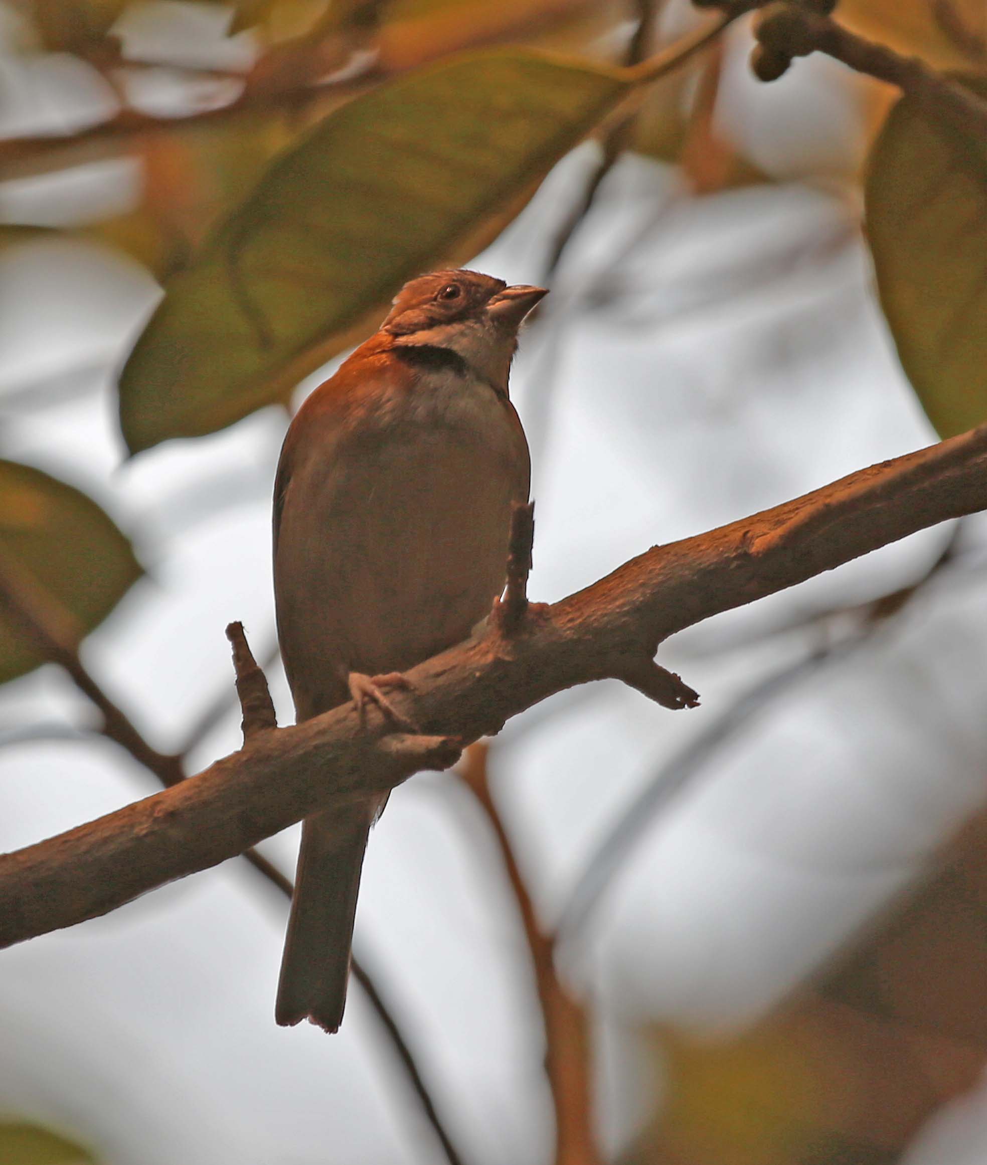 The Rufous-collared Sparrow is found from southeast Mexico south to Tierra del Fuego, the south most tip of South America. There are between 25-29 subspecies of this bird. Variations between the subspecies include size and lightness/darkness of the plumage. Sexes are similar and the dominate feature is the black stripes on a gray head with a white throat. A black line goes through the eye. The body has a rufous collar with black patches, gray/rufous underparts and upperparts are shades of brown.