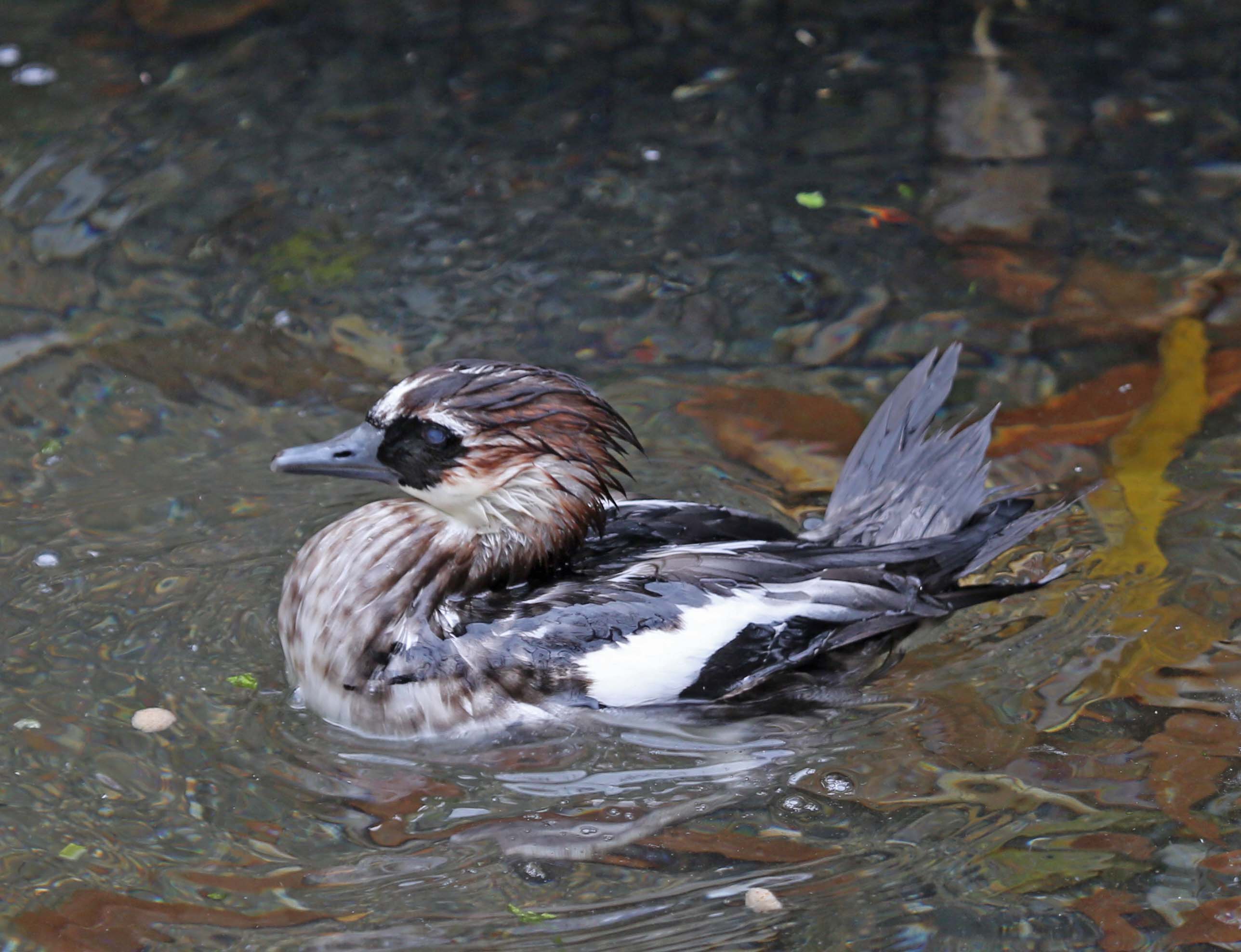 Smew are sexually dimorphic with the male mostly white which black lines and a black patch around the eye. Females have a gray body, a white head with chestnut forehead and crown. Their bill has serrated edges and a hooked tip to help catch fish that it dives for.