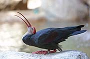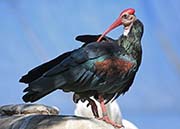 The Southern Bald Ibis is found in southern Africa. They prefer open grassland or semi-desert. They are large, glossy blue-black with a coppery patch on wings. They have a bald red head with white face, a long, red, decurved bill and red legs and feet.