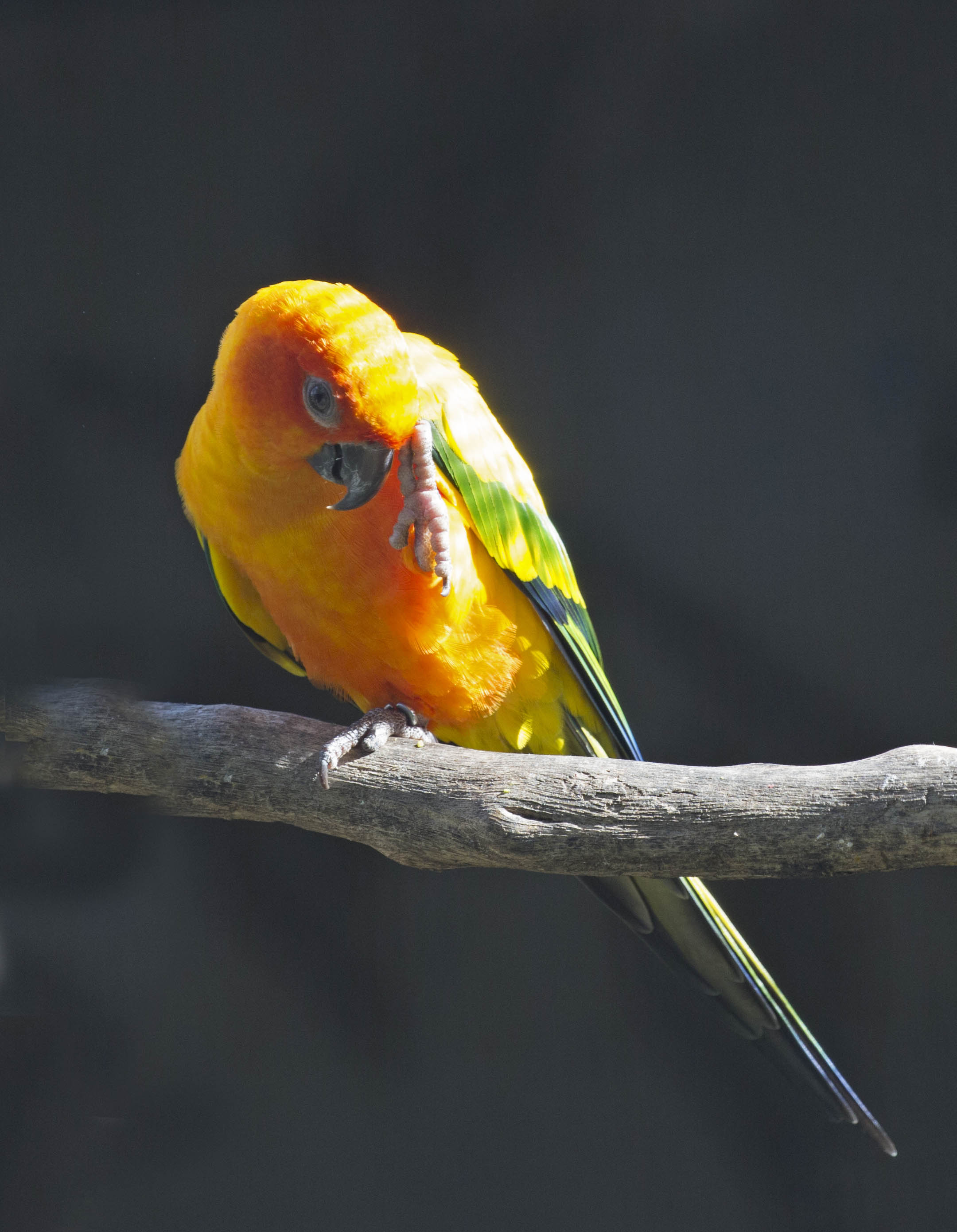 The Sun Parakeet or Sun Conure is a parrot that is found in northeastern South America. They are considered social birds and live in large flocks. Diet may include fruits and berries.