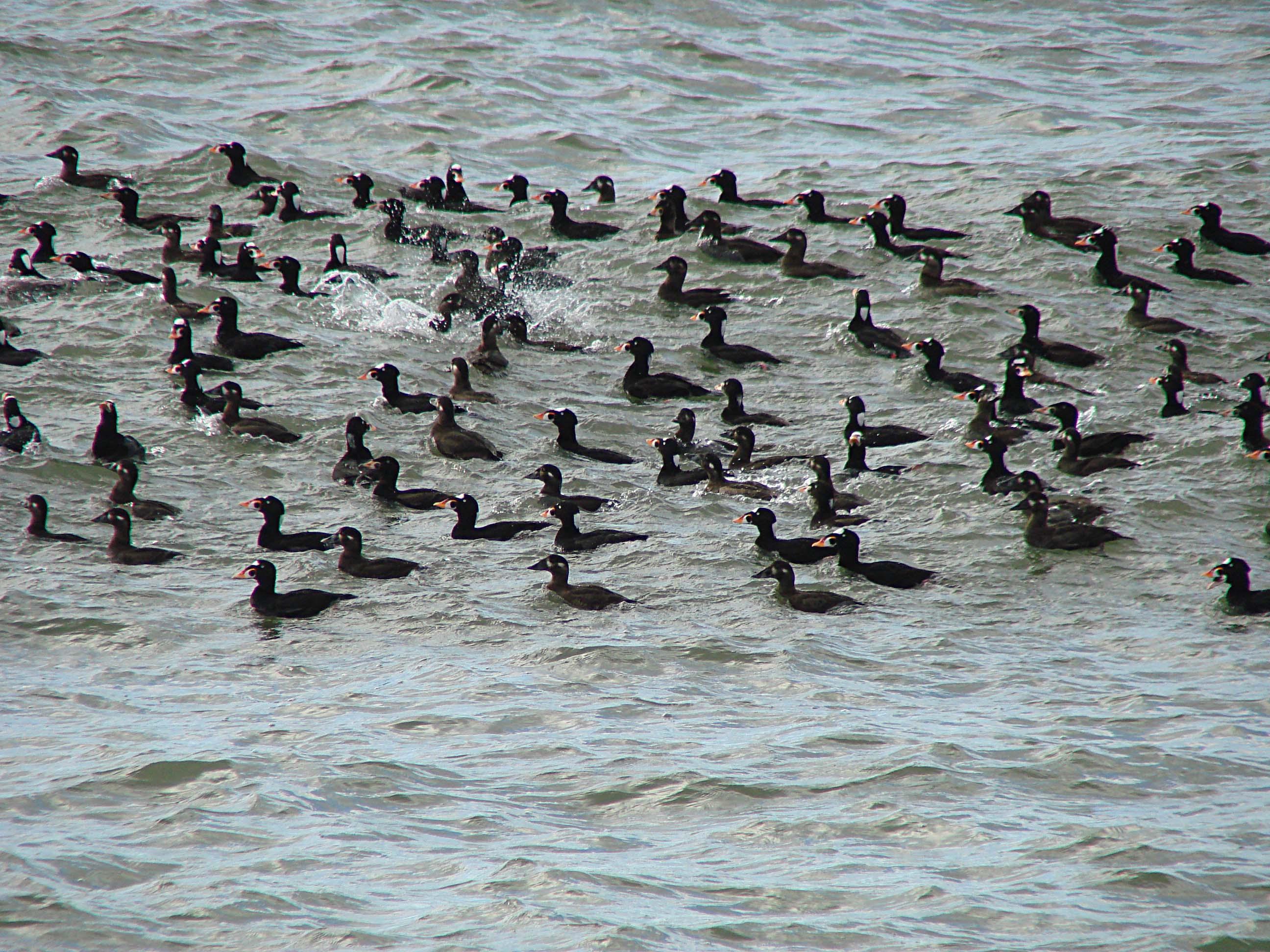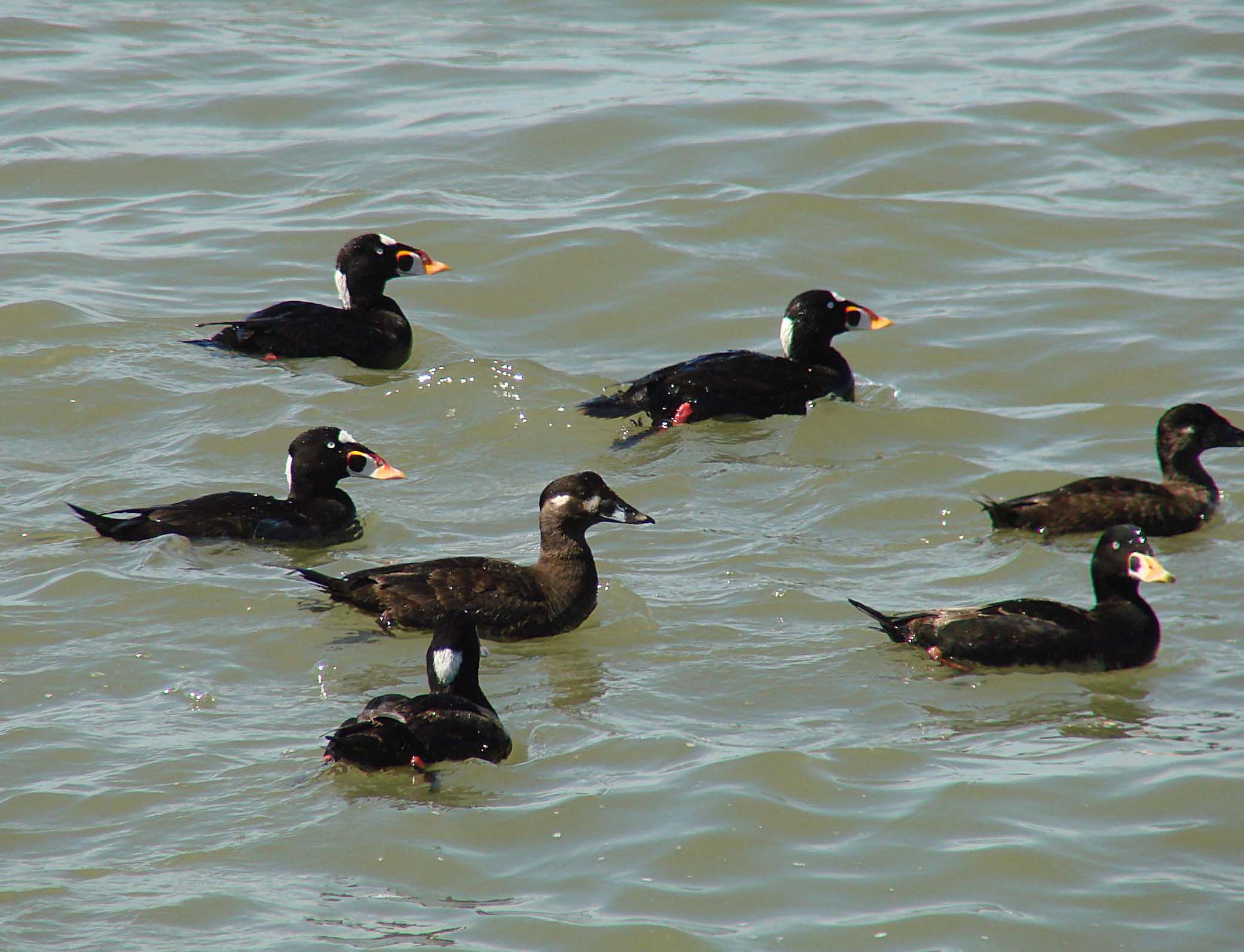 Surf Scoters are found in North America. They winter along the eastern and western coasts and breed in northern Canada and Alaska. According to one source, the San Francisco Bay region supports the largest wintering population of Surf Scoters in the Pacific Flyway. Some of the best places in the East Bay, is at the Martin Luther Regional Park in Oakland, Miller Knox Park in Point Richmond, and the Cesar Chavez Park in Berkeley.