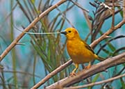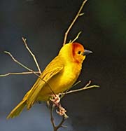The Taveta Golden Weaver, or Taveta Weaver, is found in Kenya and Tanzania. The sexes are dimorphic (have different plumage). The male is a mostly a bright golden yellow, the head has a reddish ring of various width around it, the bill is black and the feet and legs are pinkish. Females are more of an olive color with pale streaks.