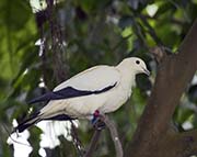 The Torresian Imperial Pigeon has also been known as the Nutmeg Pigeon or the Torres Strait Pigeon. They are a large pigeon and are white with black flight feathers. Parts of the tail and some spots on the undertail coverts are also black.