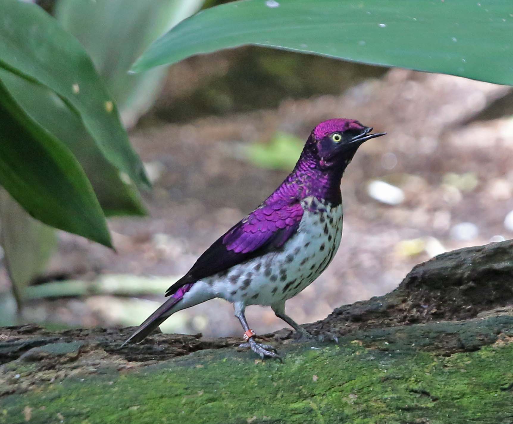The Violet-backed Starling is also known as the Amethyst Starling and the Plum-colored Starling. There are three recognized subspecies. It is one of the world's 114 starling species. The male is a deep iridescent violet set off by a white breast with black splotches. the feet and bill are black. The female is sexually dimorphic. The brown head and back and white underparts and are heavily streaked with dark brown. Juveniles are similar to the females.