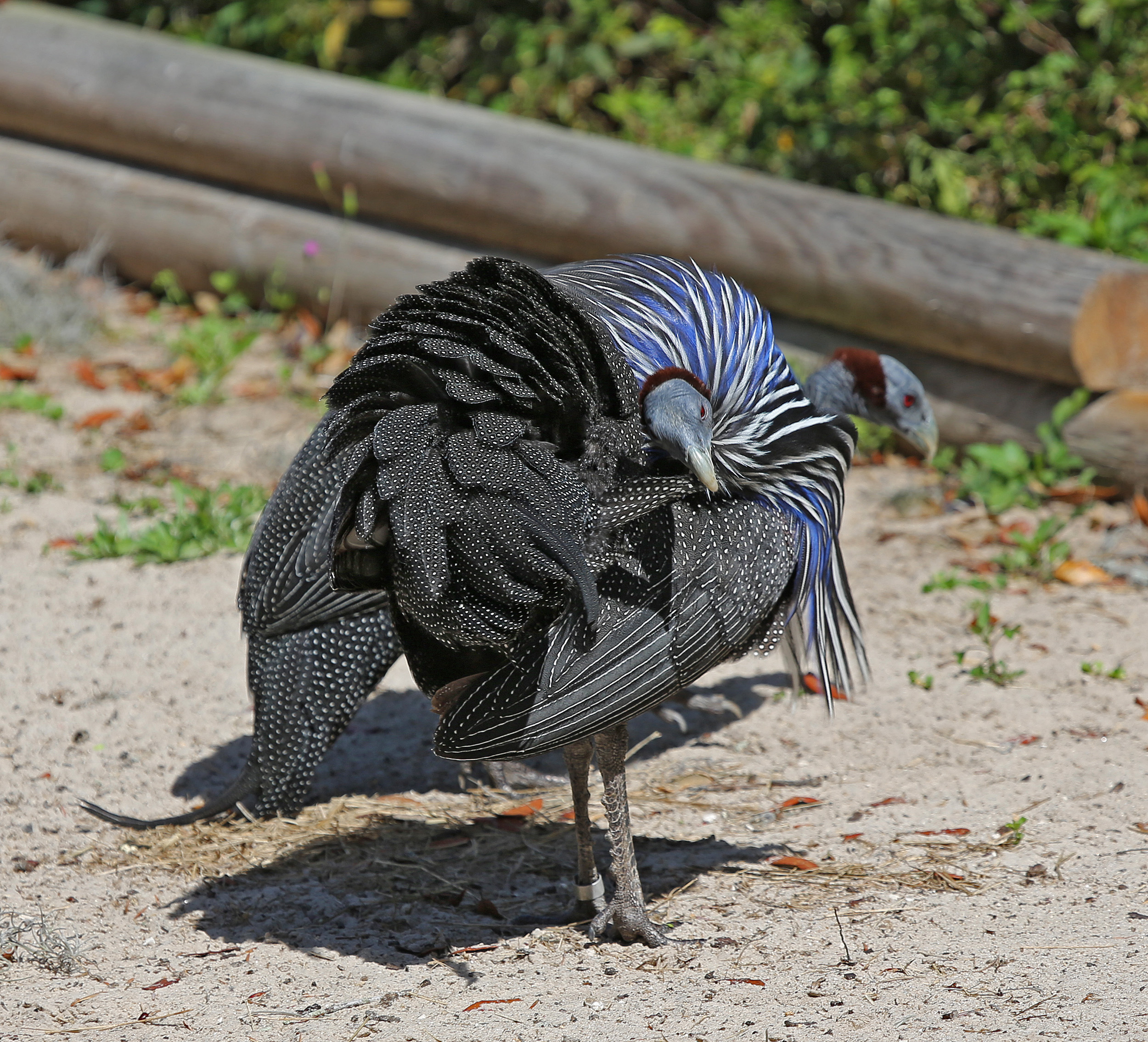 The Vulturine Guineafowl is found in Africa from southern Ethiopia through Kenya and into northern Tanzania. Diet includes insects and seeds.