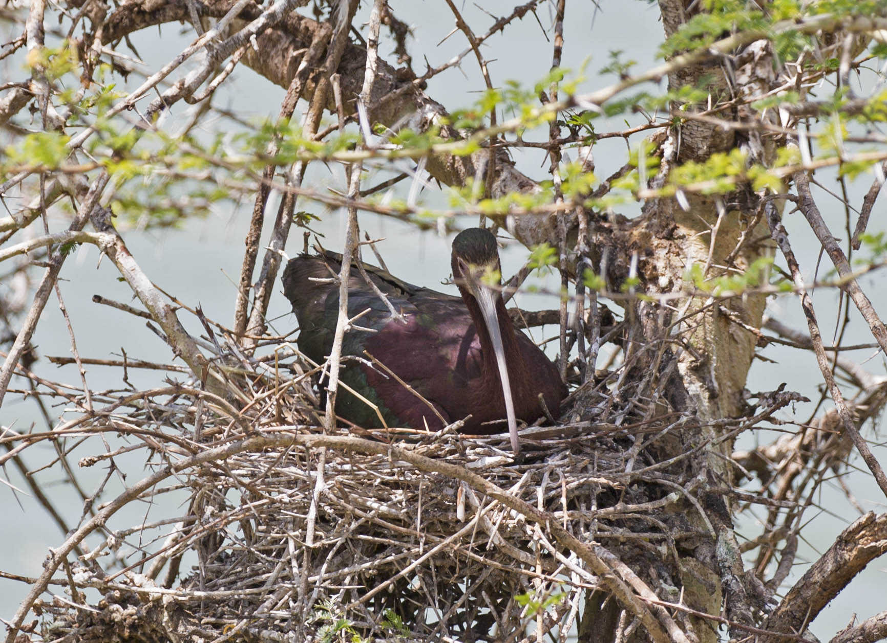 White-faced Ibis are found in western and central U.S., Mexico and southeast South America. They breed in marshes in bushes and low trees. Sexes are similar and they are chestnut-brown with a long de-curved bill and red eyes and legs. During breeding, they have a white band around their bare face. They eat insects, earthworms, fish, crayfish, and small mammals.