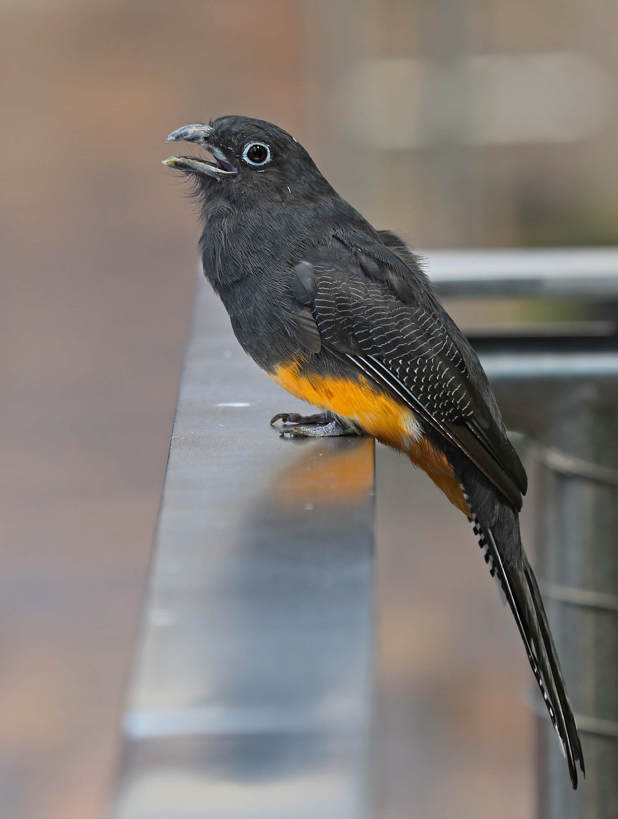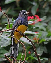 The White-tailed Trogon is also known as the Western White-tailed Trogon. The White-tailed Trogon is sexually dimorphic. Males are black with a metallic green and blue wash over their black feathers. Their belly is orange-yellow and the undersides of their tail is mostly white. Female do not have the metallic green and blue wash and are more gray than black. Their tail is barred black and white. Both sexes have a pale blue eye-ring, reddish brown eyes, and gray bill, legs and feet.