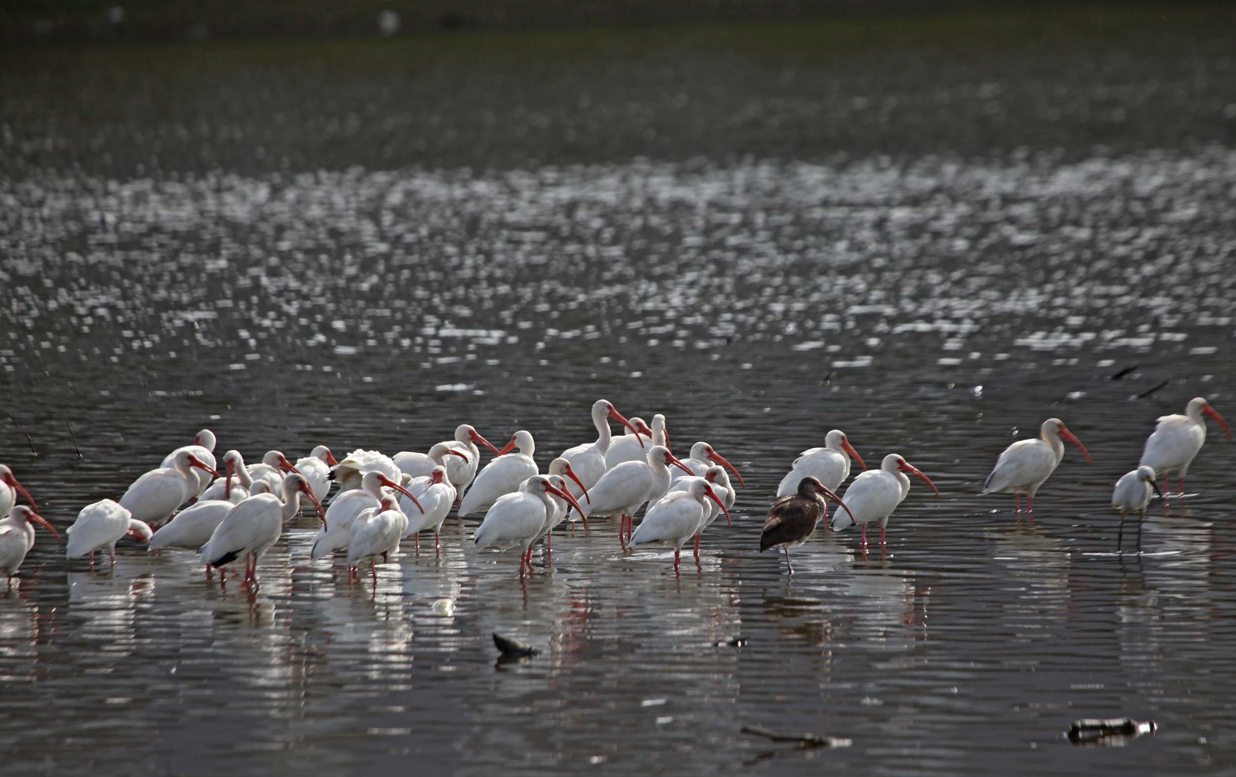 The White Ibis or American White Ibis is a wading bird that lives in marshy wetlands and ponds. they are found from the mid-Atlantic and Gulf Coast of the U.S. south through most of the New World tropics. White Ibis feed by probing with their long, tonged beak. They eat fish, frogs and other water creatures such as frogs and insects.