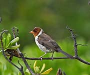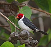 The Yellow-billed Cardinal is in the tanager family and is an import to the Big Island of Hawaii from South America (Brazil, Bolivia, Paraguay, Uruguay). The Yellow-billed Cardinal has a bright red head, black upperparts, white underparts, a black chin, a yellow bill, pinkish legs and orange eyes. Juveniles have a brownish head. At first glance, Yellow-billed Cardinals can be confused with Red-crested Cardinals, but the yellow bill and absence of a crest on the Yellow-billed Cardinals is a giveaway. Further, they are not even closely related. The population on the Big Island is probably due to released/escaped cage birds.