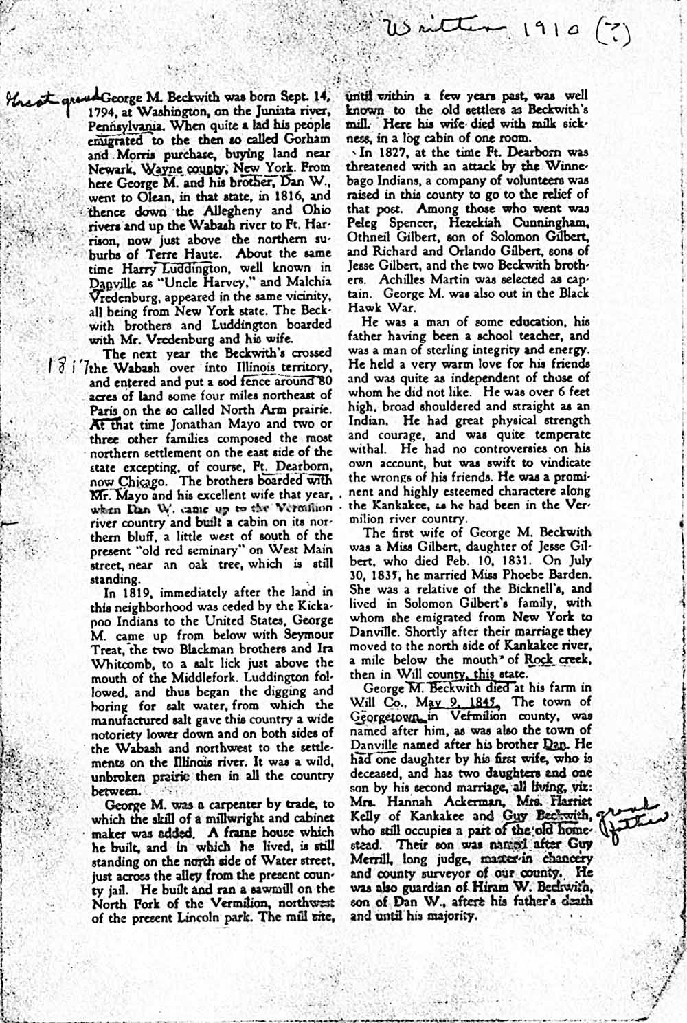 In 1827, at the time Ft. Dearborn was threatened with an attack by the Winnebago Indians, a company of volunteers was raised in this county to go to the relief of that post. Among those who went was Peleg Spencer, Hezekiah Cunningham, Othneil Gilbert, son of Solomon Gilbert, and Richard and Orlando Gilbert, sons of Jesse Gilbert, and the two Beckwith brothers. Achilles Martin was selected as captain. George M. was also out in the Black Hawk War. He was a man of some education, his father having been a school teacher, and was a man of sterling integrity and energy. He held a very warm love for his friends and was quite as independent of those of whom he did not like. He was over 6 feet high, broad shouldered and straight as an Indian. He had great physical strength and courage, and was quite temperate withal. He had no controversies on his own account, but was swift to vindicate the wrongs of his friends. He was a prominent and highly esteemed charactere along the Kankakee, as he had been in the Vermilion river country. The first wife of George M. Beckwith was a Miss Gilbert, daughter of Jesse Gilbert, who died Feb. 10, 1831. On July 30, 1835, he married Miss Phoebe Barden. She was a relative of the Bicknell’s, and lived in Solomon Gilbert’s family, with whom she emigrated from New York to Danville. Shortly after their marriage they moved to the north side of Kankakee river, a mile below the mouth of Rock creek, then in Will county, this state. George M. Beckwith died at his farm in Will Co., May 9, 1845. The town of Georgetown, Vermilion county, was named after him, as was also the town of Danville named after his brother Dan. He had one daughter by his first wife who is deceased, and has two daughters and one son by his second marriage all living viz: Mrs. Hannah Ackerman, Mrs. Harriet Kelly of Kankakee and Guy Beckwith who still occupies a part of the old homestead. Their son was named after Guy Merrill, long judge, master in chancery and county surveyor of our county. He was also guardian of Hiram W. Beckwith, son of Dan W., aftere his father’s death and until his majority. |
