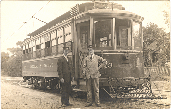 Edgar Peter Redmon, 1883-1951 (on the left) as a streetcar conductor, Joliet, Ill., ca. 1910.